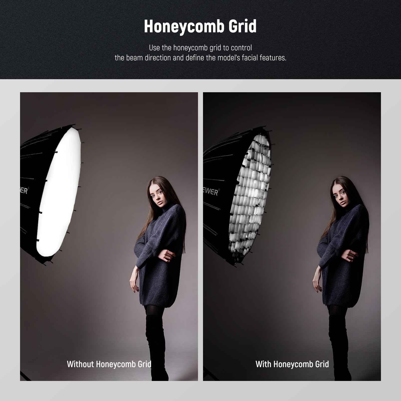 • Customizable Honeycomb Grid & Diffusers- Using the honeycomb grid can make the light shape more confined and directional, allowing the beam angle to be concentrated at 45°, which gives photographers a dramatic and expressive light effect to define their model's facial structure. The 2 pieces of high-quality diffusers can be freely combined in use