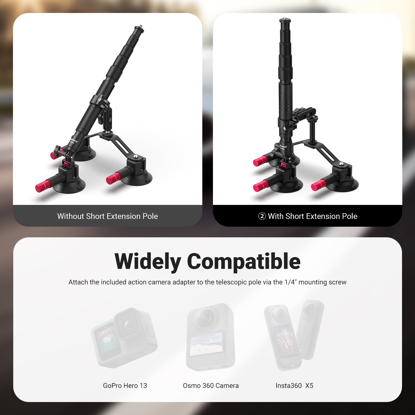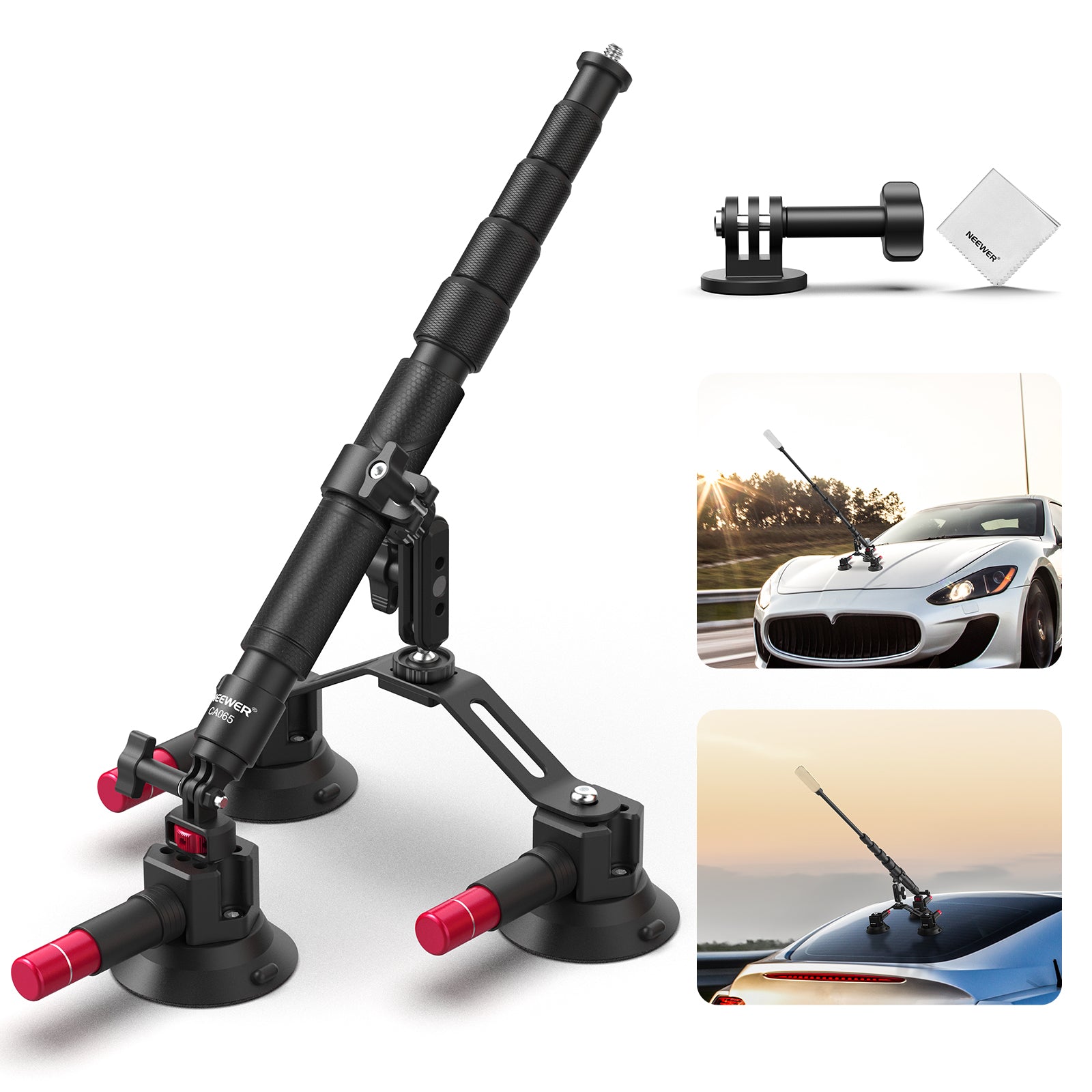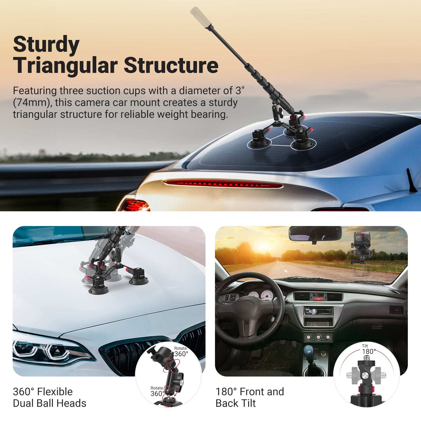 - Triple Suction Cup Car Mount Kit- Capture immersive POV (point of view) footage from unique driving angles like your engine hood, windshield inside/outside, car dash, or car side. The suction cup camera mount stand holder securely attaches your action camera with three powerful suction cups, and enables flexible positioning with extension poles and a ball head magic arm for video recording, with a safety lanyard for added safety. Note to use at speeds below 80 km/h to prevent accidental drops