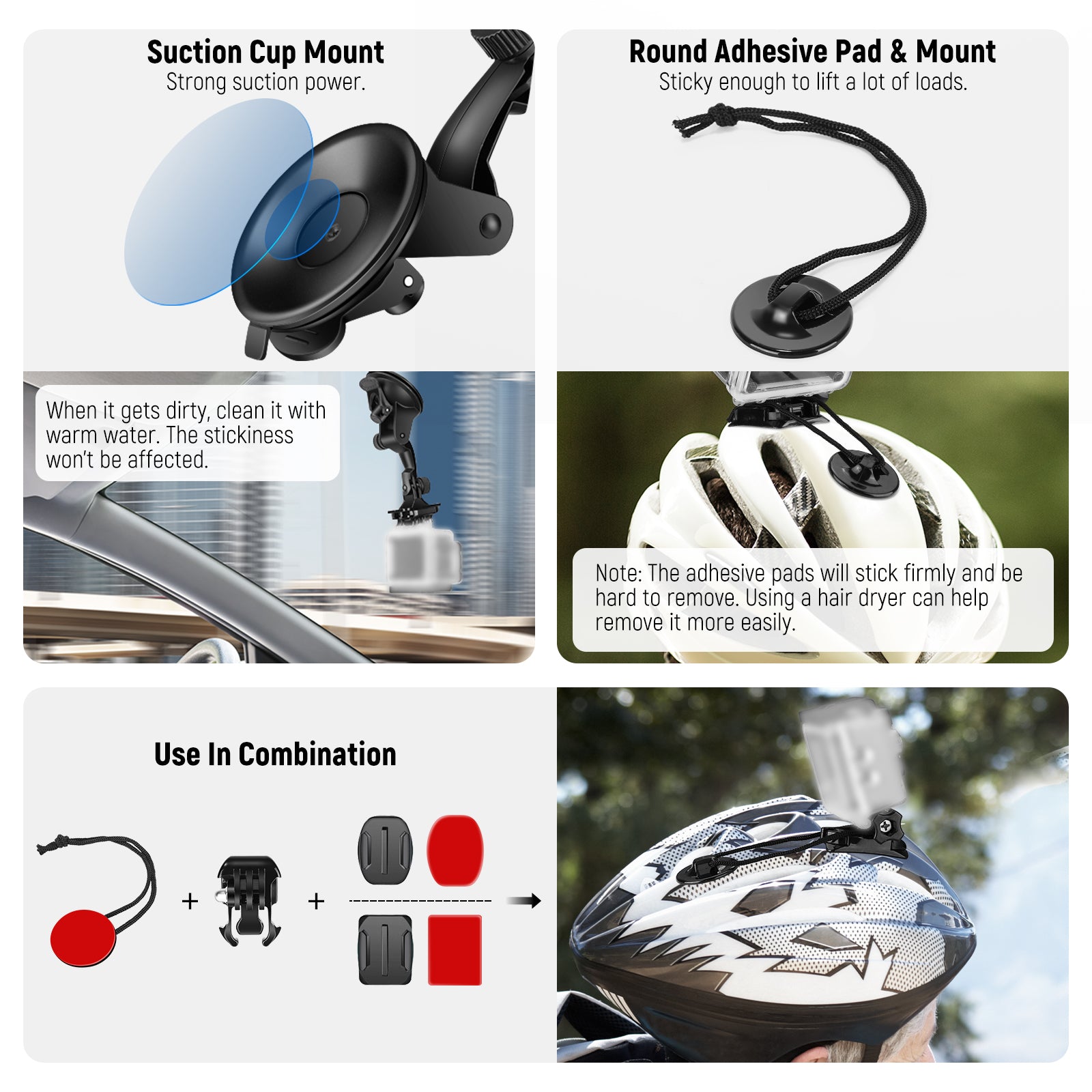 - Bike Mount & Suction Cup- Mount your camera on the handlebars of your bike with the handlebar mount. It fits bars 0.75”/1.9cm to 1.4”/3.6cm in diameter and supports 180° tilt. The suction cup attaches your camera to the car for recording footage on the road