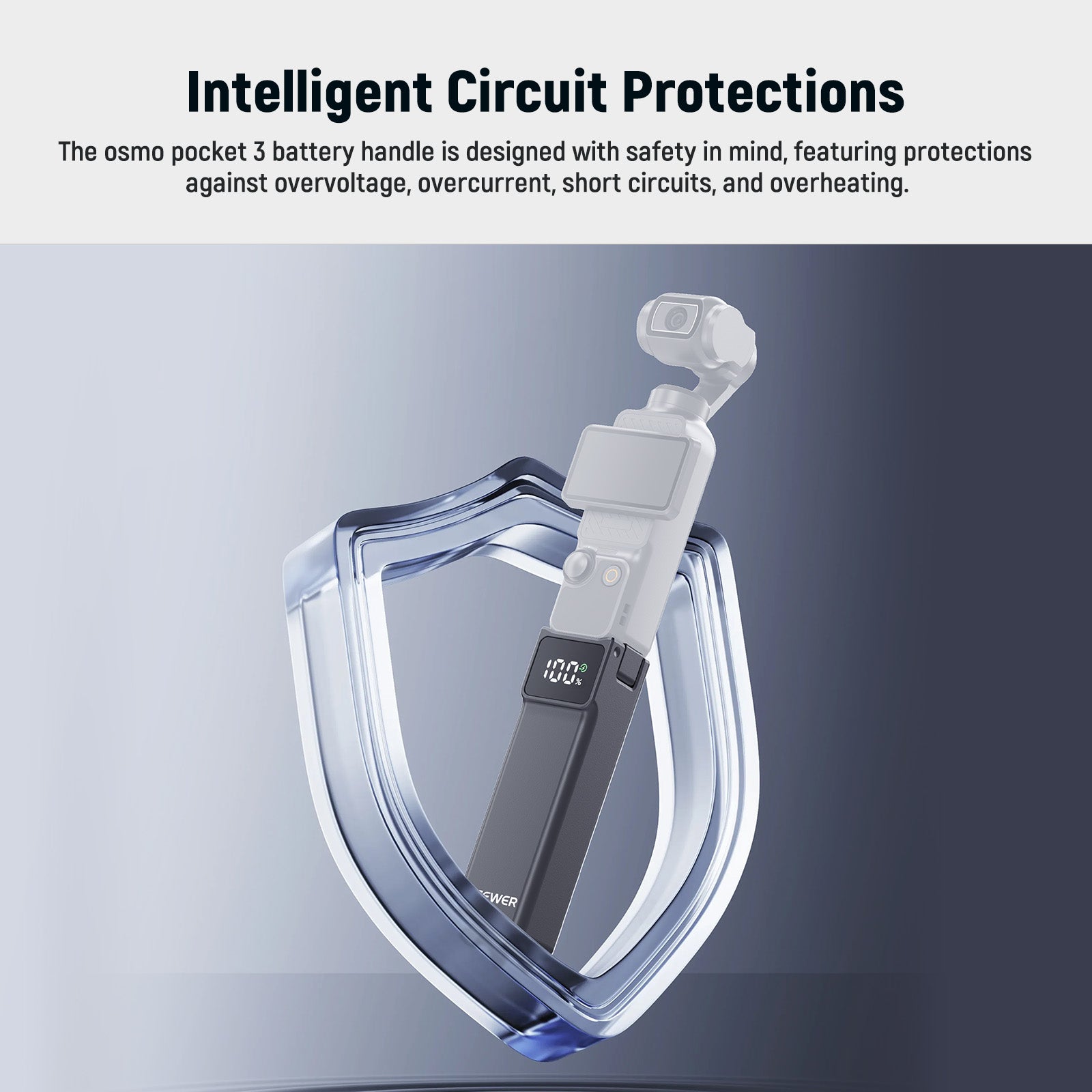 - Intelligent Circuit Protections- The osmo pocket 3 battery handle is designed with safety in mind, featuring protections against overvoltage, overcurrent, short circuits, and overheating. If an issue arises, the handle will automatically shut down after the screen sends an alert, giving you peace of mind while in use