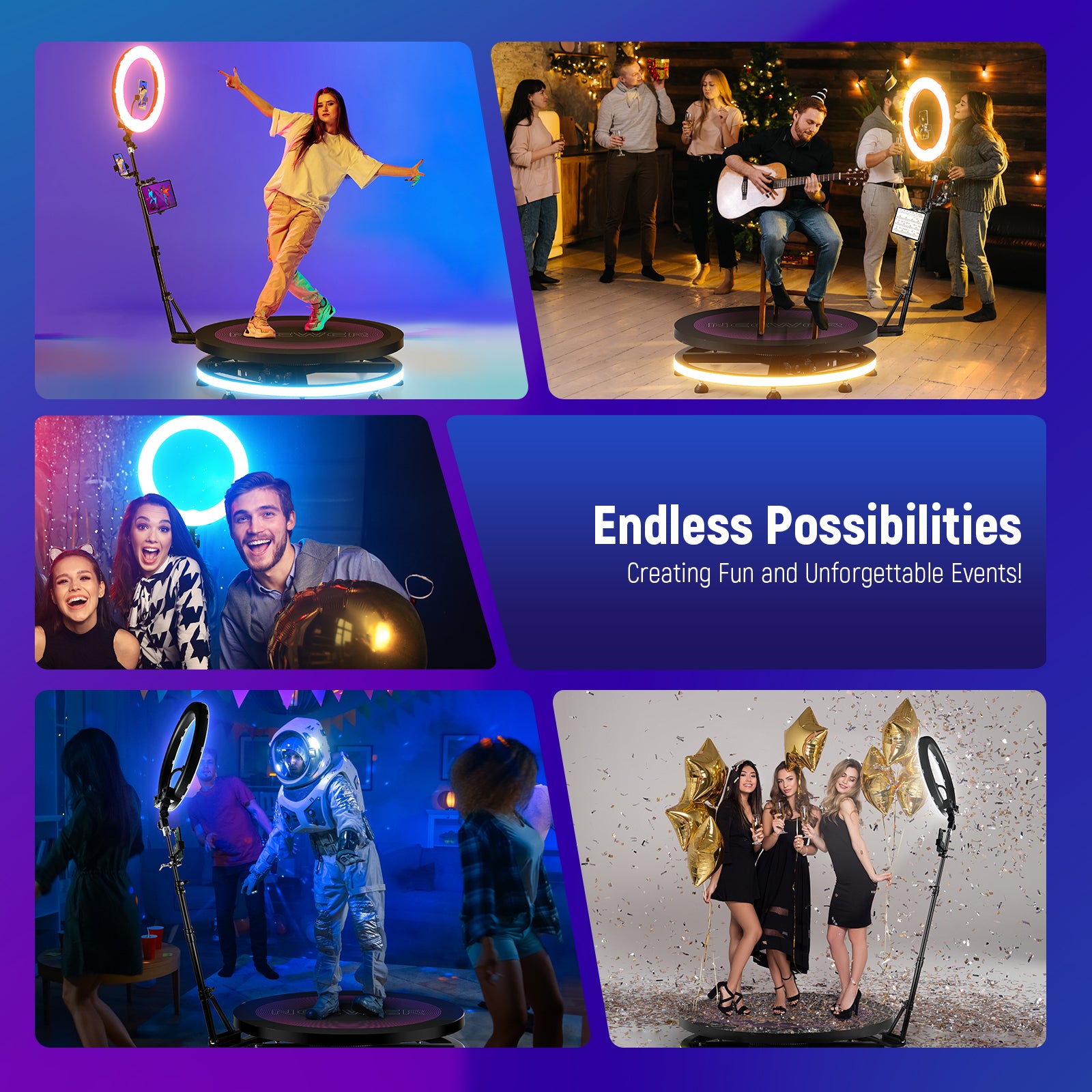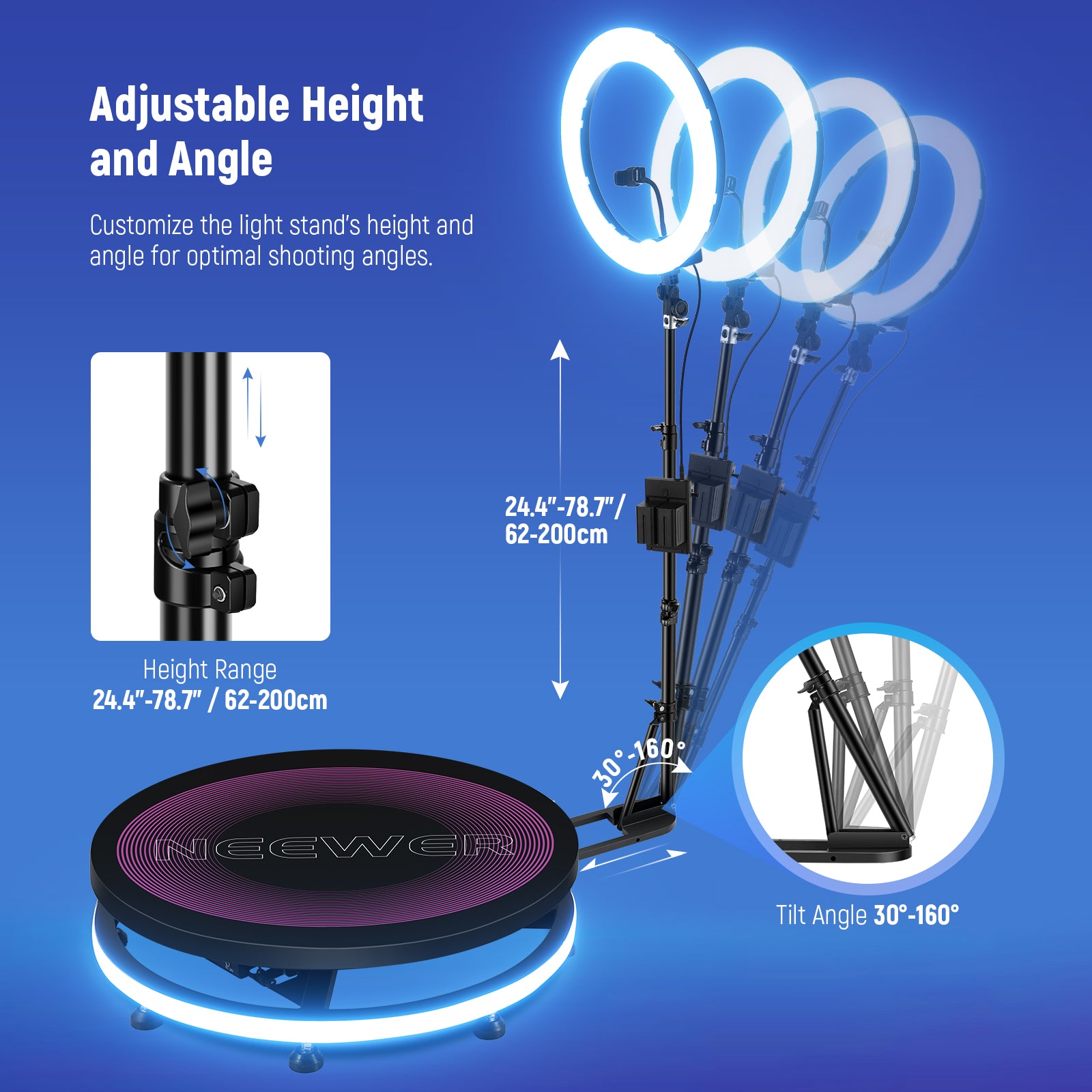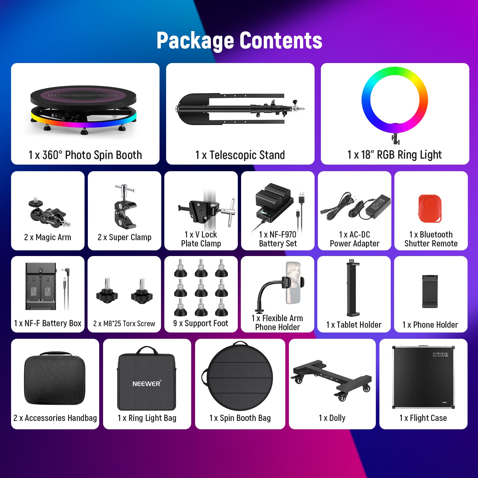 - 360° Panoramic Selfie Photo Booth- Introducing the NEEWER 360 Photo Booth Kit, an all-in-one solution for content creators and YouTube/TikTok streamers. It combines a 100cm/39.4" 360° Spin (customizable image cover), RGB LED strip, RGB 18” ring light with APP control, and various accessories supporting multiple devices. Ideal for 360° shots, HD slow motion, GIF, and video for 1-3 people or objects, taking your artistic and commercial ventures to the next level