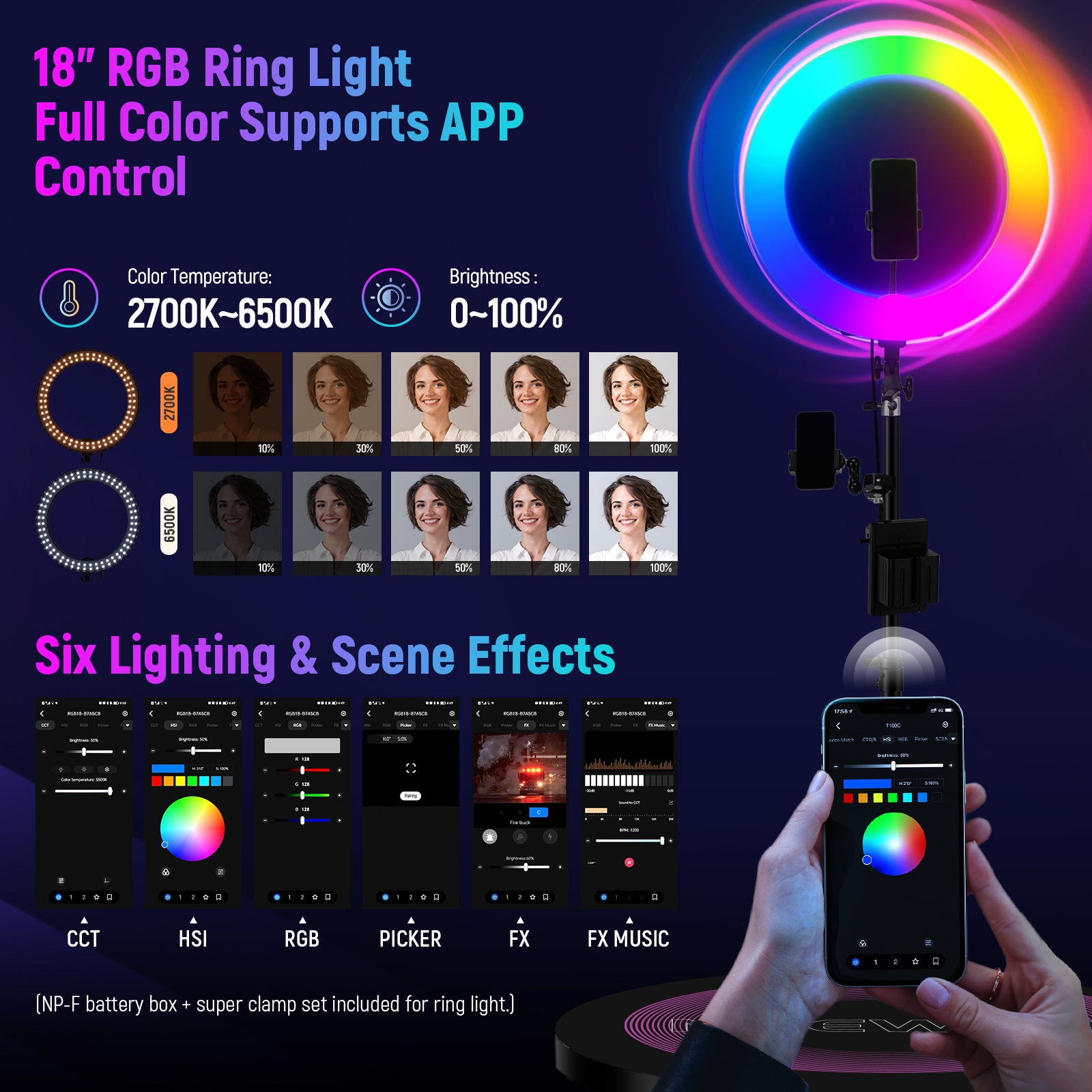 - 18" RGB Ring Light- The NEEWER RGB18 (II) features excellent 360° full-color light with 180° adjustable tilt. It offers six dimming modes, including CCT/HSI/RGB/Picker/FX/FX Music, and supports preset scene light effects that sync with the music. With an adjustable color temperature range of 2500K to 10000K and a high CRI97+, it is perfect for multi-person fill light needs. Bluetooth remote control via the NEEWER app enhances its usability