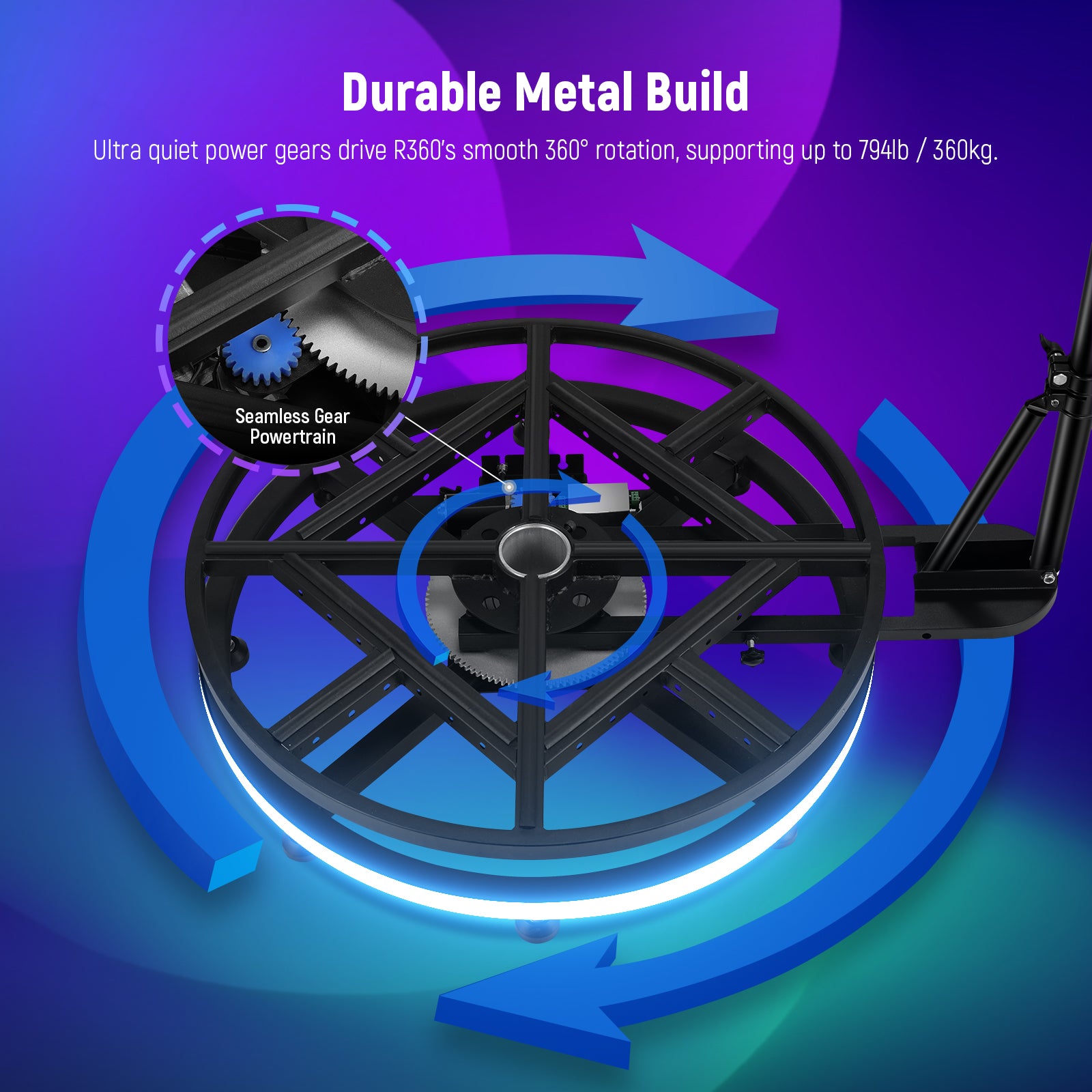 - Silent Operation & All Metal Turntable- The NEEWER R360 boasts high-quality power gear sets for super low noise during rotation. Its thick all-metal construction ensures a robust and load-bearing capacity, supporting a maximum static load of 800lb (360kg). This stability makes it an ideal pivot point for high-speed rotation of the light stand