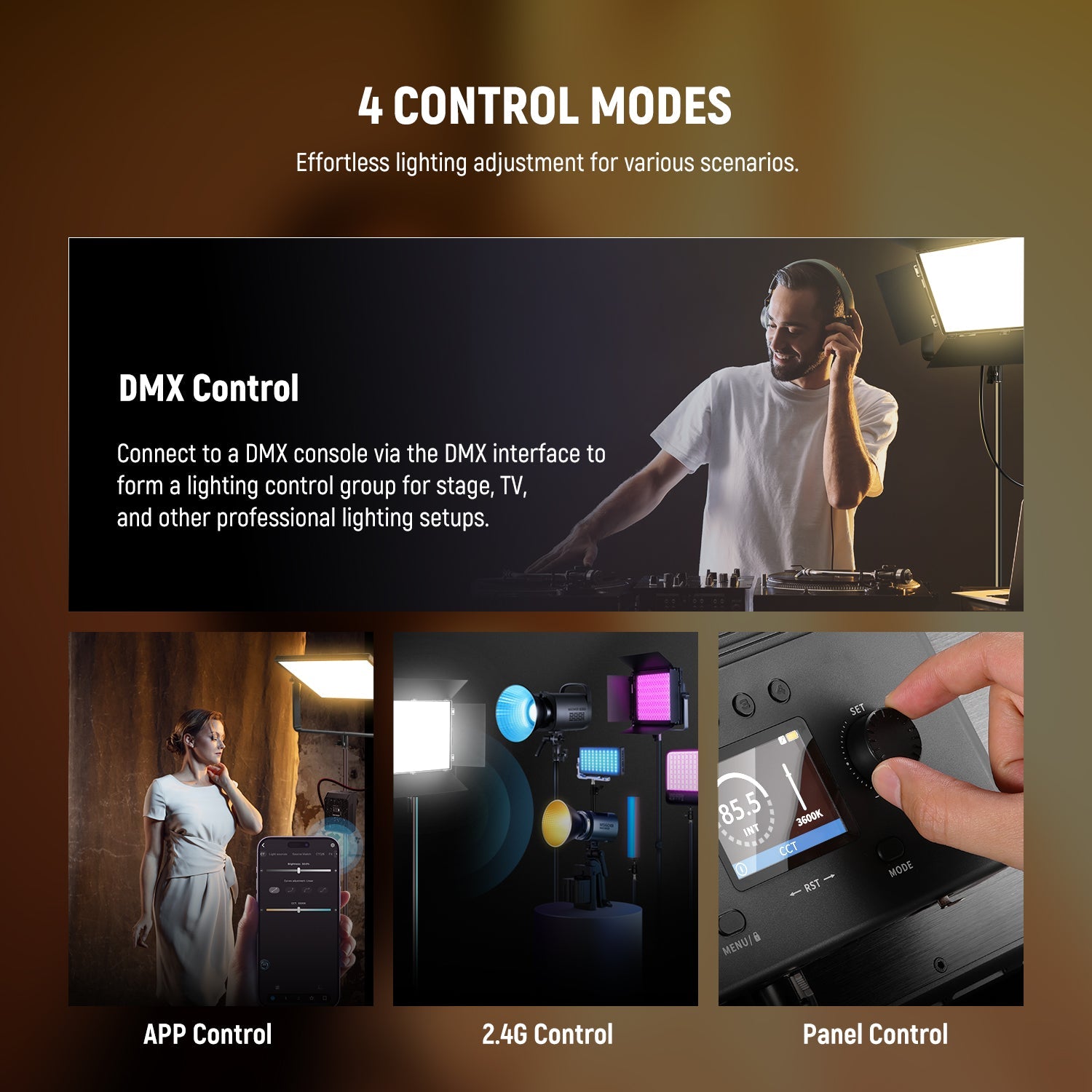 - APP/2.4G/Panel/DMX Control- 4 control methods to meet both the pro and novice. Easily achieve wireless control and multi light group management via the NEEWER APP; realize master and slave light control (AP150C, PL60C, FS300C, FS150C, RGB2, RGB1200, MS60C, MC60B, MS150B, FS150B, BH30S, CB60B, etc.) with the built in 2.4G module; and make parameter adjustments easily with the panel with a TFT color display. A 5 pin DMX port can connect to a DMX console for complex multi light setups