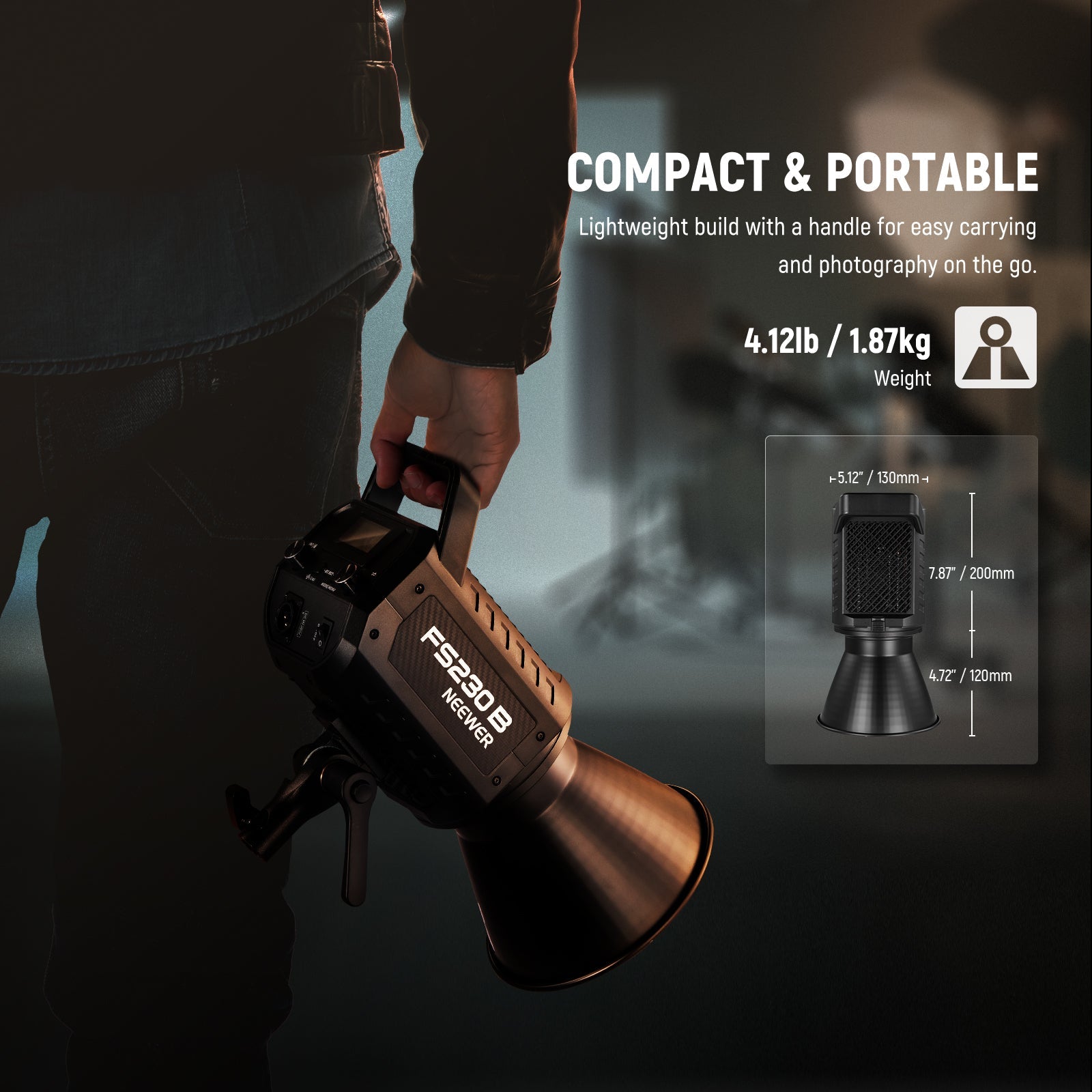 - 230W Powerful Compact Studio Light- NEEWER FS230B Continuous Video Light uses premium and efficient COB LEDs for exceptional brightness, high 230W output, and 110000lux/1m maximum illuminance. The portable spotlight weighs only 3.8lb (1.7kg) and measures 7.9"x5.1"x4.7" (200x130x120mm), with a 180° tilt stand mount adapter for free angle setups. Ideal for portrait photography lighting, interviews, YouTube/TikTok video recording, filming, live streaming, and studio production