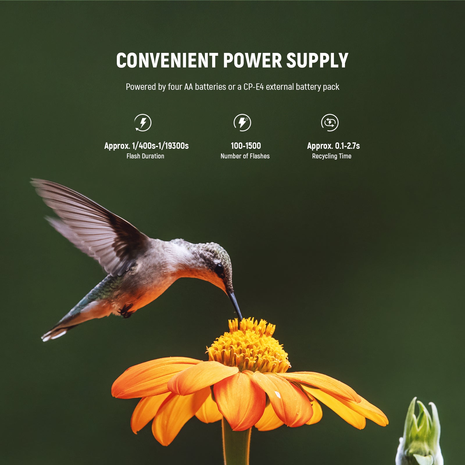 - Powerful Output with Advanced Functions- The macro flash features 76Ws output, GN15 guide number (ISO100, 1M), exposure compensation, exposure bracketing, flash lock, front/rear curtain sync, a PC sync jack, and other functions. Powered by 4x AA battery, the flash ring supports 1/400-1/19300s flash duration, 0.1-2.7s recycling time, and 100-1500 flashes, or connect the flash to an external power source via the CP-E4 port to speed up recycling time.Requires 1.5V high-drain rechargeable or alkaline batteries for power supply.