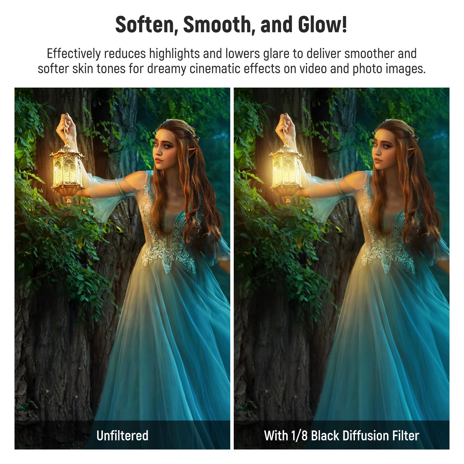 - 1/8 Black Diffusion Filter for Cinematic Effect- The 1/8 stop black diffusion filter effectively reduces highlights and lowers glare to deliver smoother and softer skin tone for dreamy cinematic effect on video and photo image. Ideal for portrait photography, video recording, and vlogging
