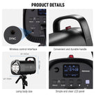 - Efficient & Silent Heat Dissipation- The newly upgraded heat dissipation system adopts a silent cooling fan and superior radiators to effectively decrease operating temperature in studio flash photography, prolong the monolight lifespan, create a quiet shooting environment, and prevent overheating even after 260 continuous full power flashes