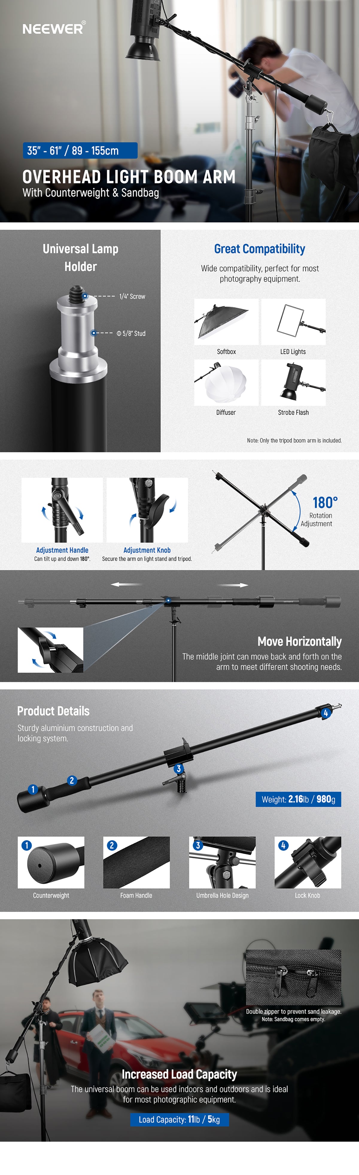 - Expansion with 2 Sections- NEEWER tripod boom arm, length 35" to 61" (89 to 155cm). Attach the boom arm to the light stand and easily adjust the 180° swivel to get the perfect angle for your shooting needs (NOTE: Light Stand is NOT Included)
