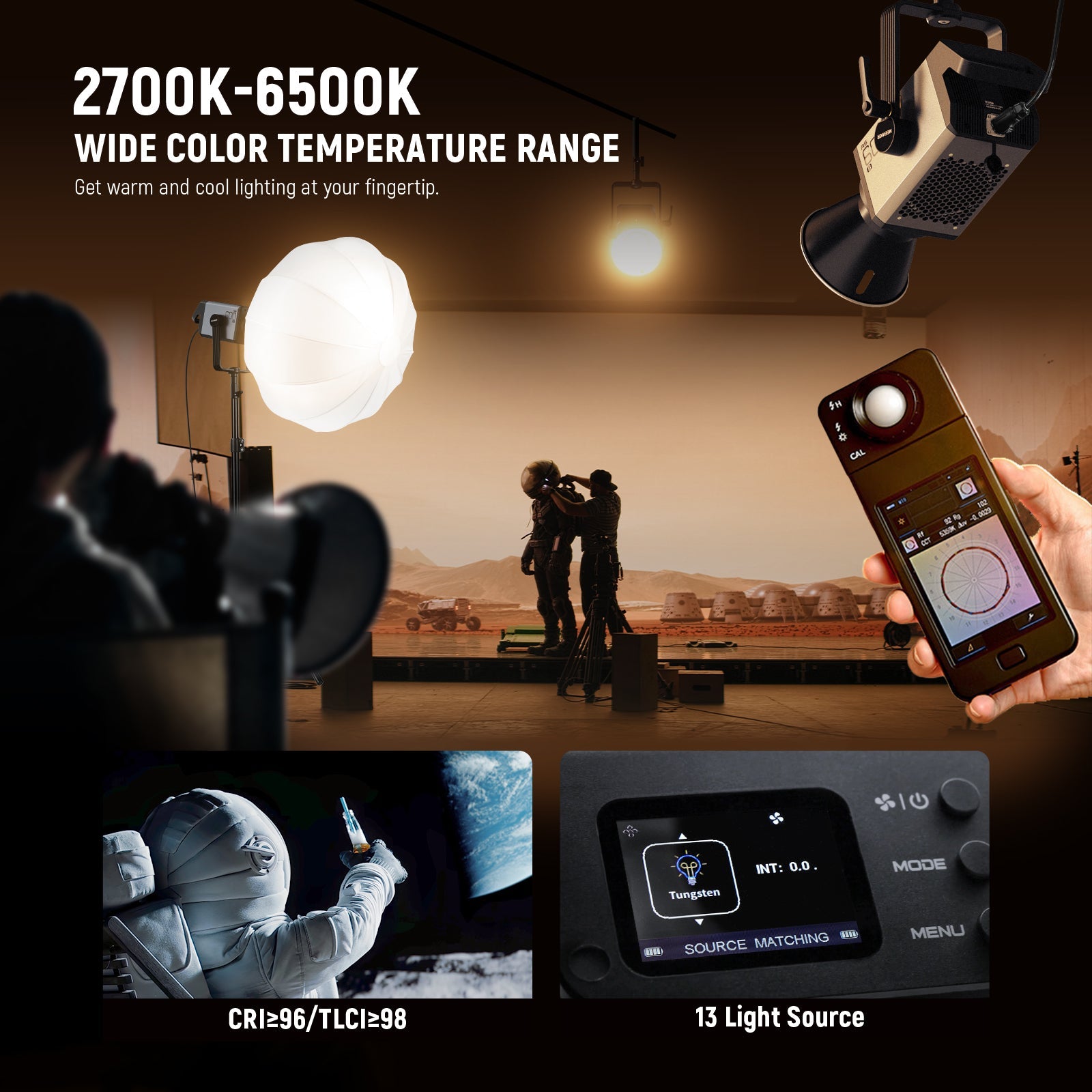 - Quick & Precise Adjustment- PWM technology provides 4 dimming curves and allows 0-100% smooth adjustment in 0.1% increments. Under any color temperature, the Constant Brightness Mode preserves the illuminance while Maximum Power Output Mode always keeps it to the maximum. You can apply 12 scene effects, use 13 source match modes, save up to 30 presets, and enable Studio Mode to quickly recall settings from the last use