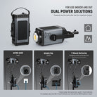 - Silent Fan & Two Power Solutions- The silent fan with auto, low, high, and silent modes ensures a quiet set for video recording. Power the light with the power adapter for illumination all day long or install two 16.8V/26V V mount batteries (not included) on the controller box for outdoor shooting. An included super clamp can attach the power adapter to a stand for a consistent power supply
