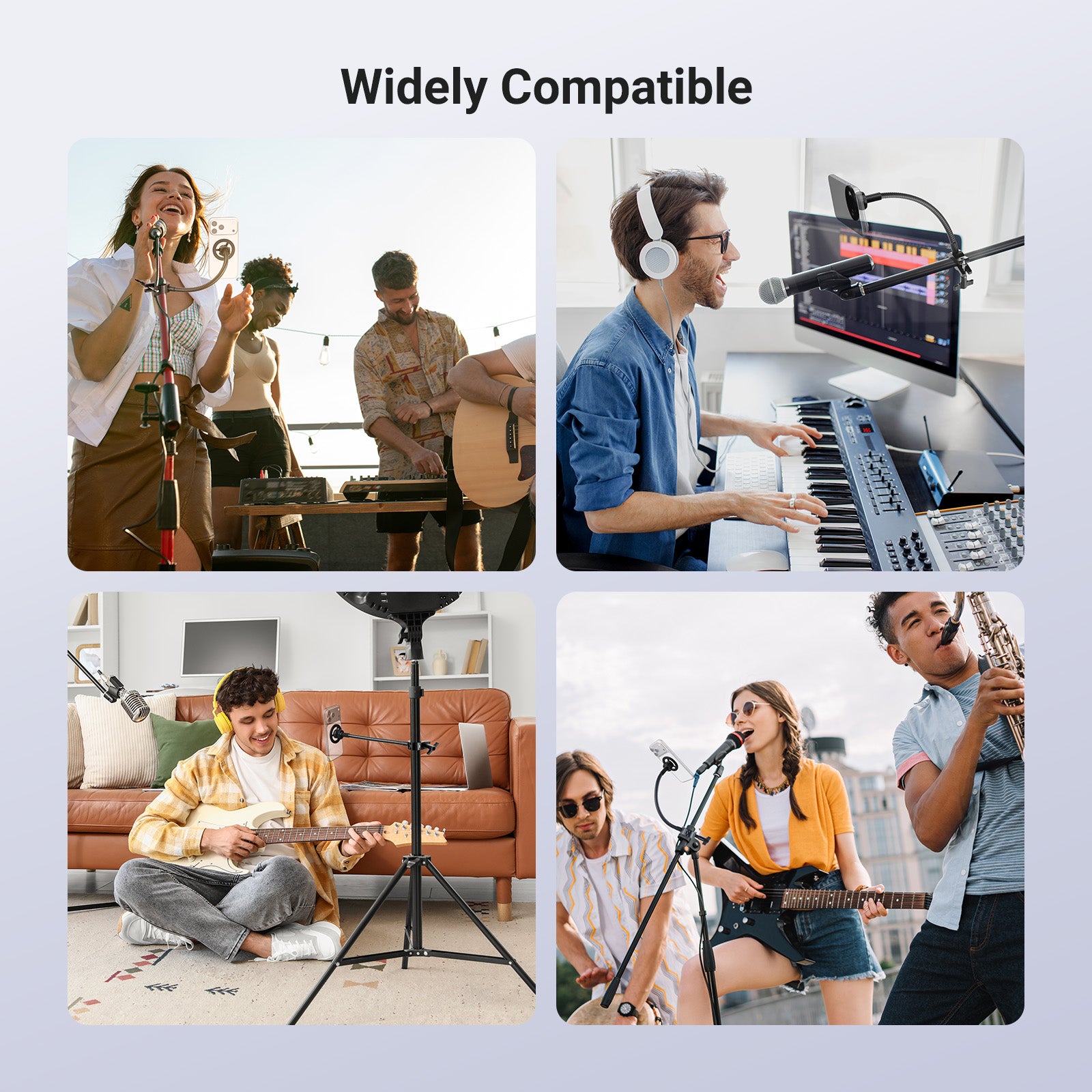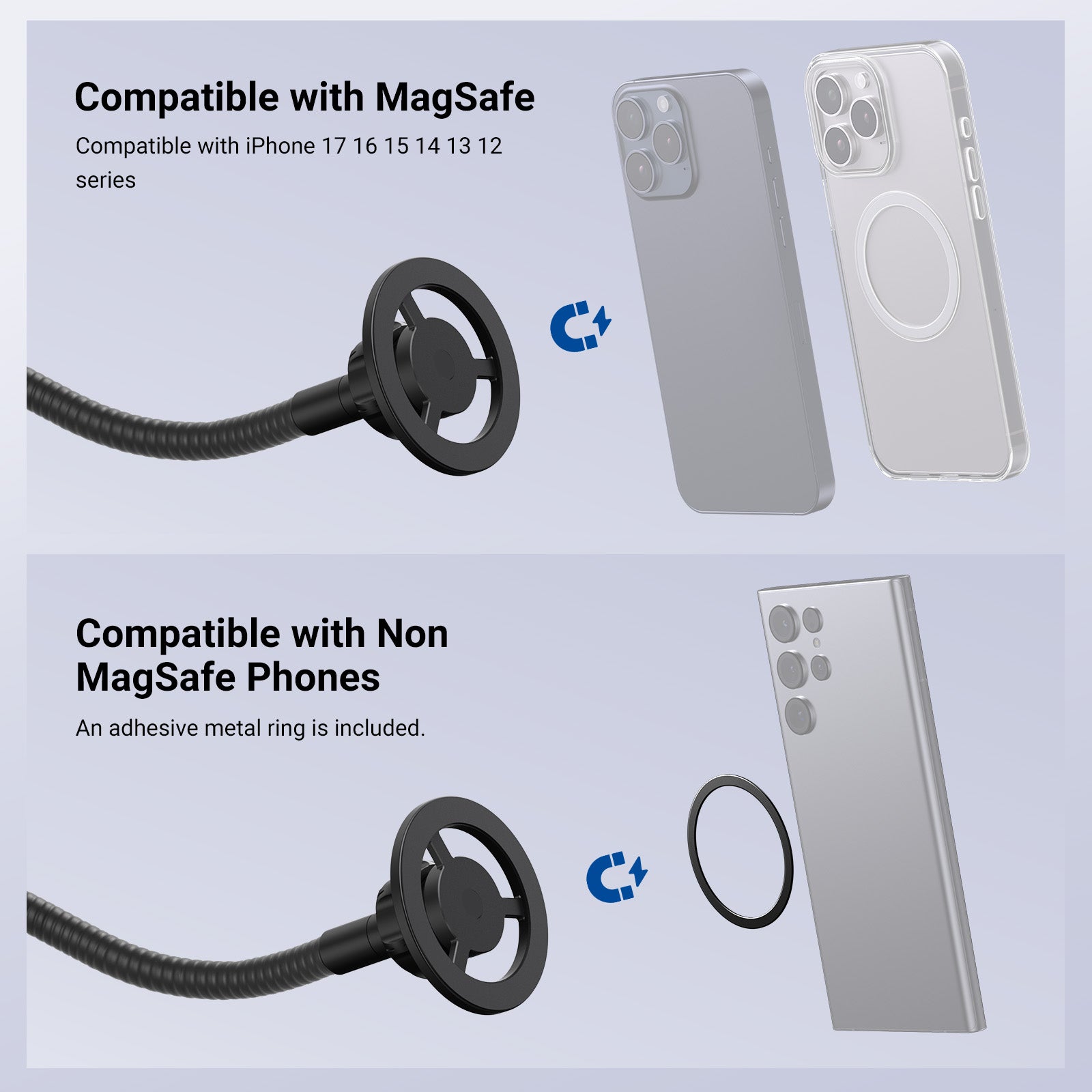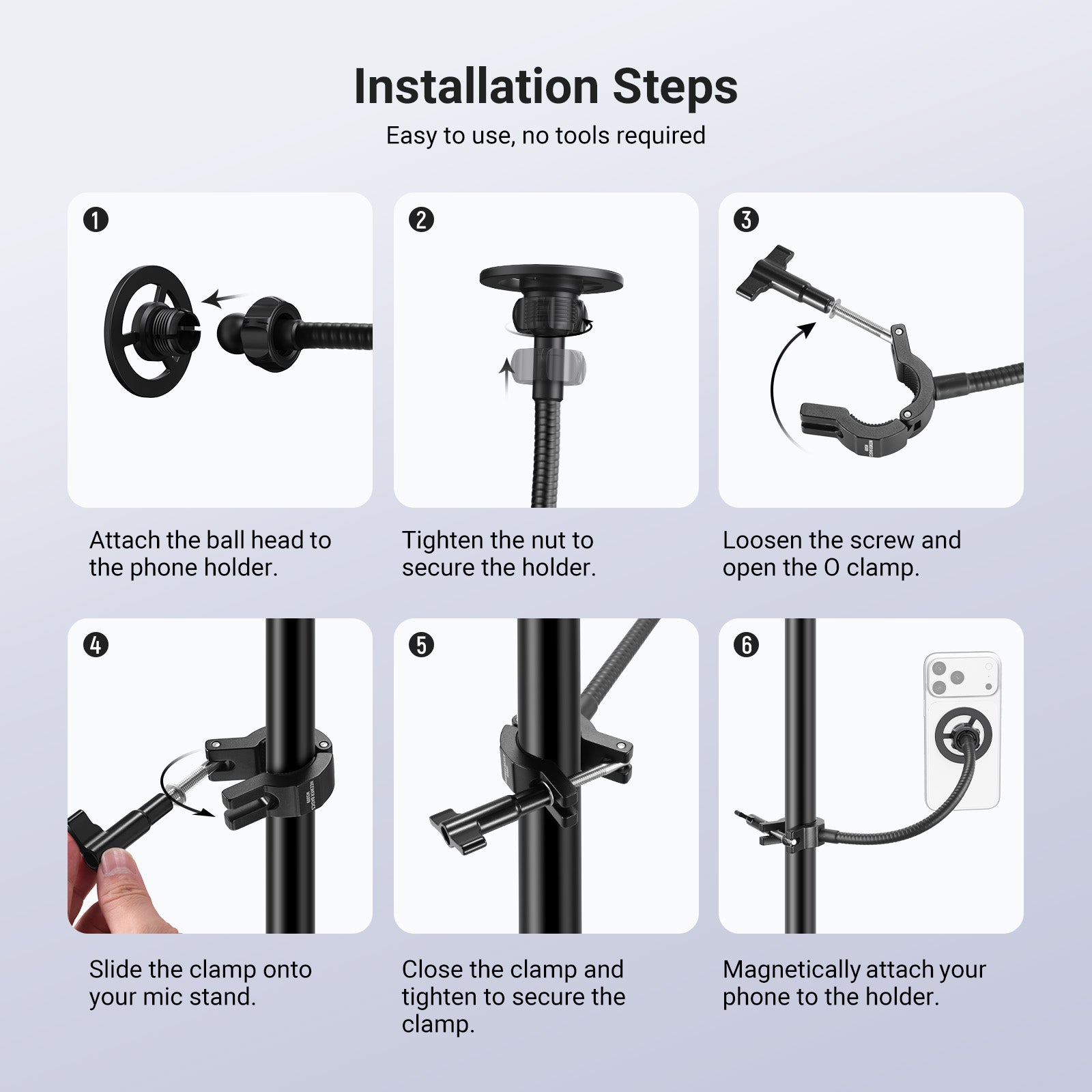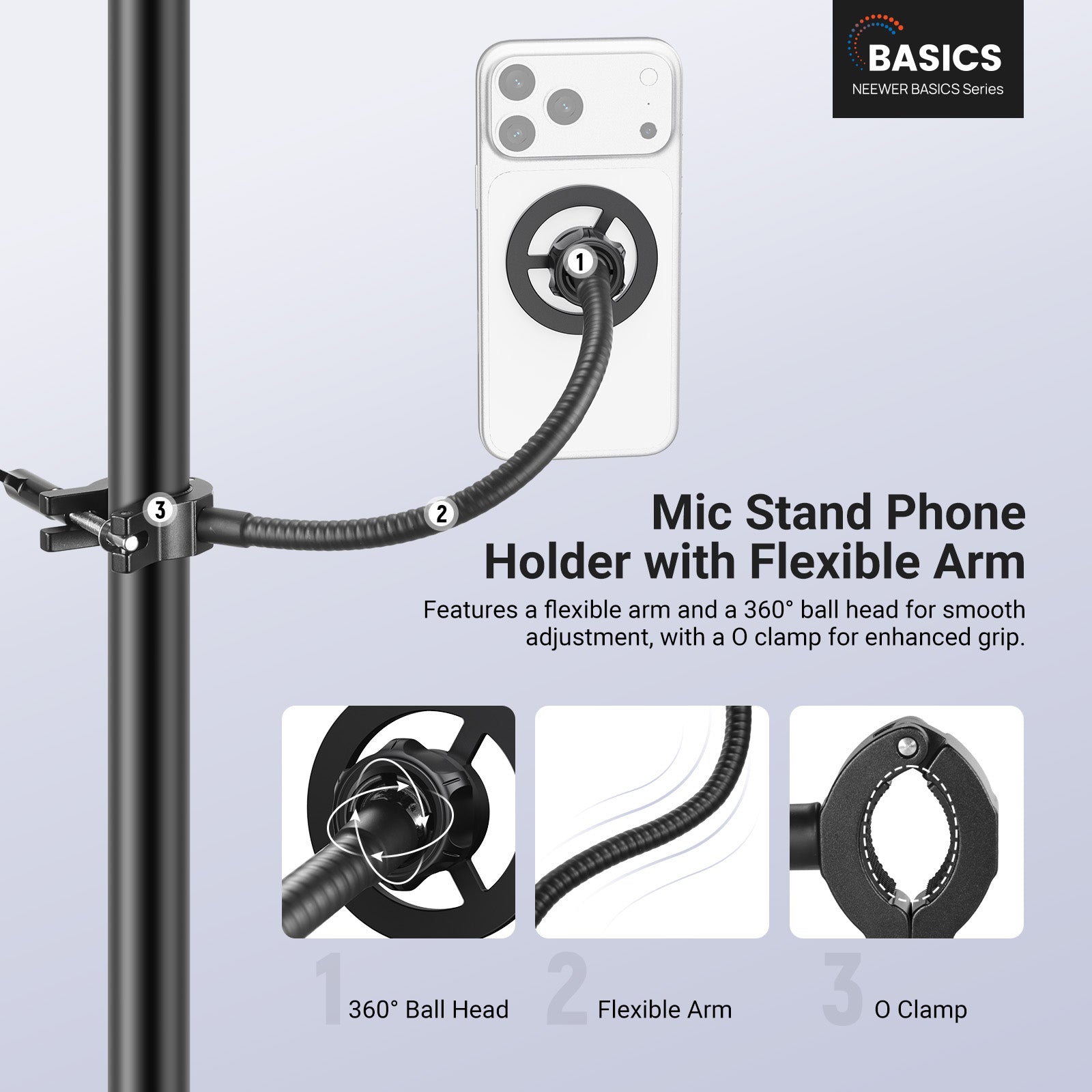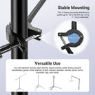 - Phone Stand Holder with Flexible Arm- The mic stand phone mount features a flexible arm and an O type clamp, all made of robust aluminum alloy, to securely attach your phone to the microphone stand for excellent stability. Its flexible tube and metal ball head allow for smooth adjustments, while the phone holder firmly grips your device, ideal for vlogging, live streaming, audio and video recording, podcast, and more videography