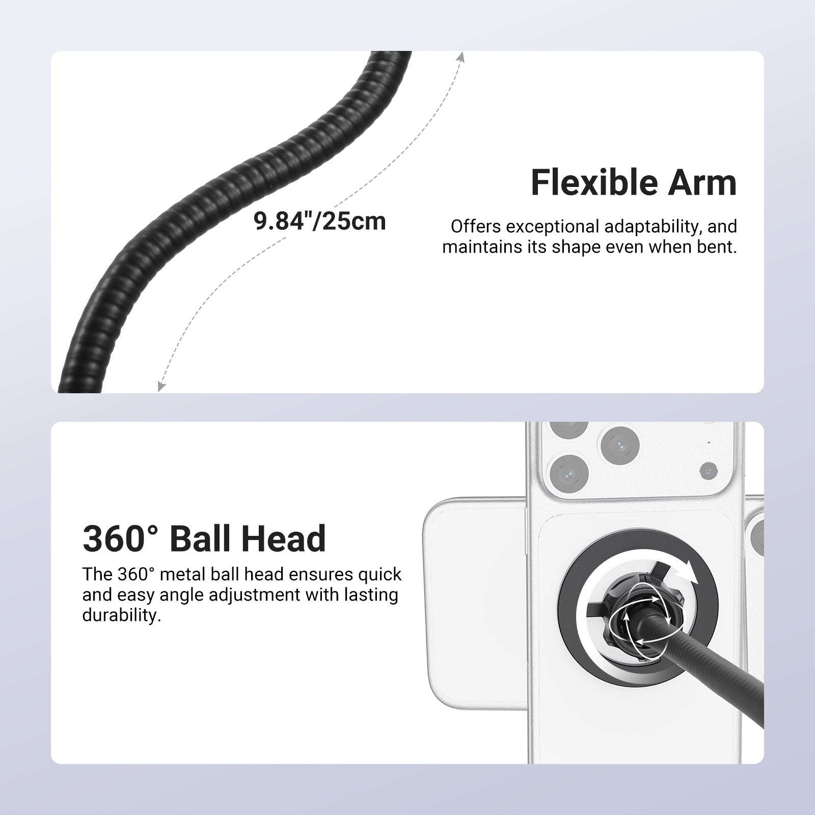 - Flexible & Smooth Adjustment- The 7.9" (20 cm) flexible boom pole arm offers exceptional adaptability, maintaining its shape even when bent, with a 360° rotatable ball head on the top, ensuring your phone stays securely at any desired angle or height. Whether for speeches, meetings, karaoke, on stage singing, band performances, studio recording, or live streams and online classes, the clip phone stand holder is always within reach