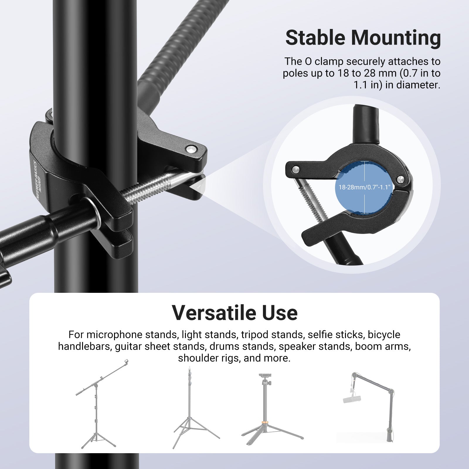 - Stable Mounting & Versatile Use- Securely grip on a pole of up to 0.7" to 1.1" (18 to 28mm) in diameter, the O type clamp is for microphone stands, light stands, tripod stands, selfie sticks, bicycle handlebars, guitar sheet stands, drums stands, speaker stands, boom arms, shoulder rigs, and more