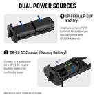 - Power Source: LP-E6/LP-E6N/LP-E6NH batteries, DC Coupler
