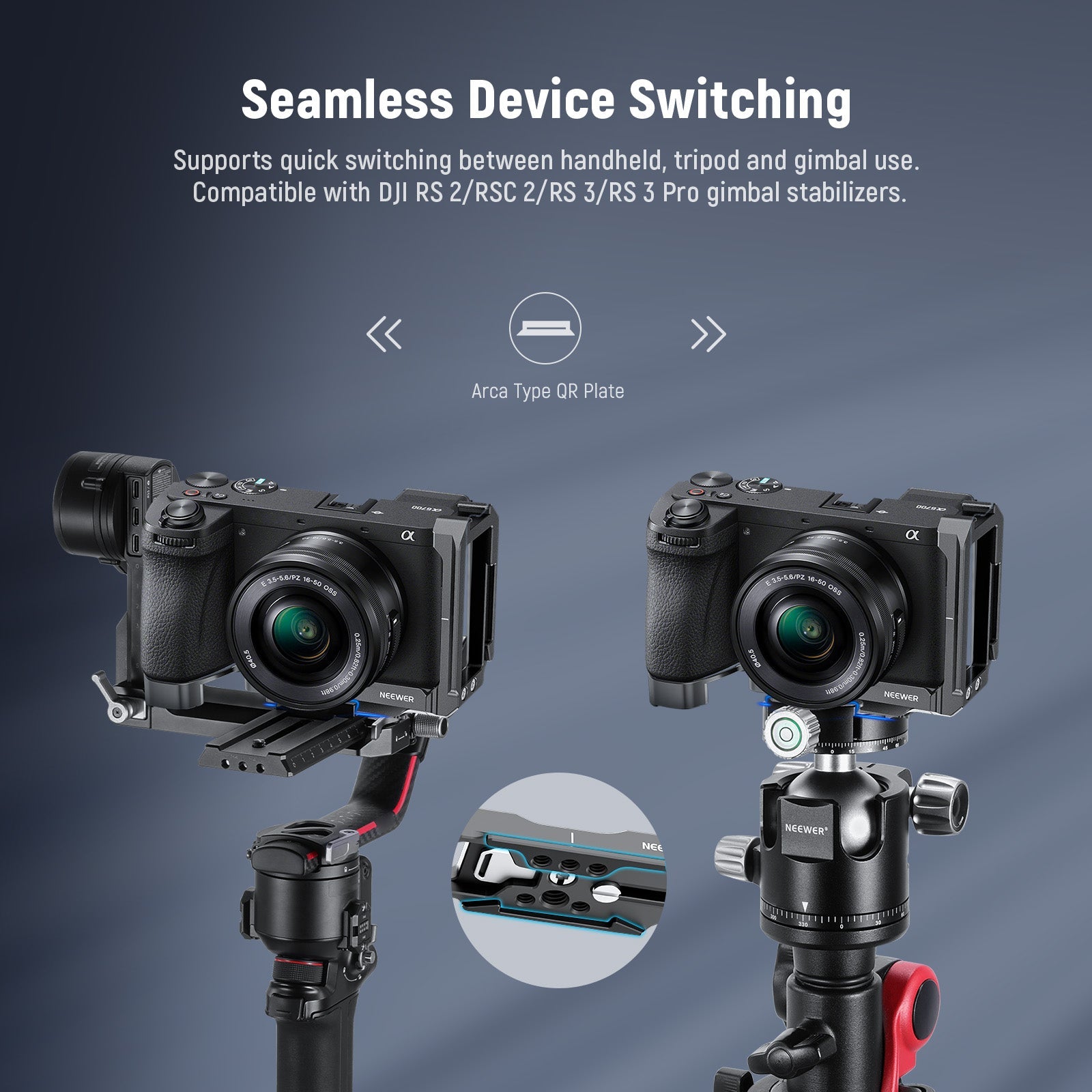 - Quick Shooting Mode Switch- Arca type baseplate and side plate allow seamless shifting between horizontal and vertical shooting. They are also compatible with DJI DJI RS2/RS3 stabilizers for quick mode switching between tripods and handheld shooting. The side plate features an anti-slip slot that is compatible with DJI's anti drop structure, it won't block α6700's EVF eyecup when shooting vertically on a gimbal