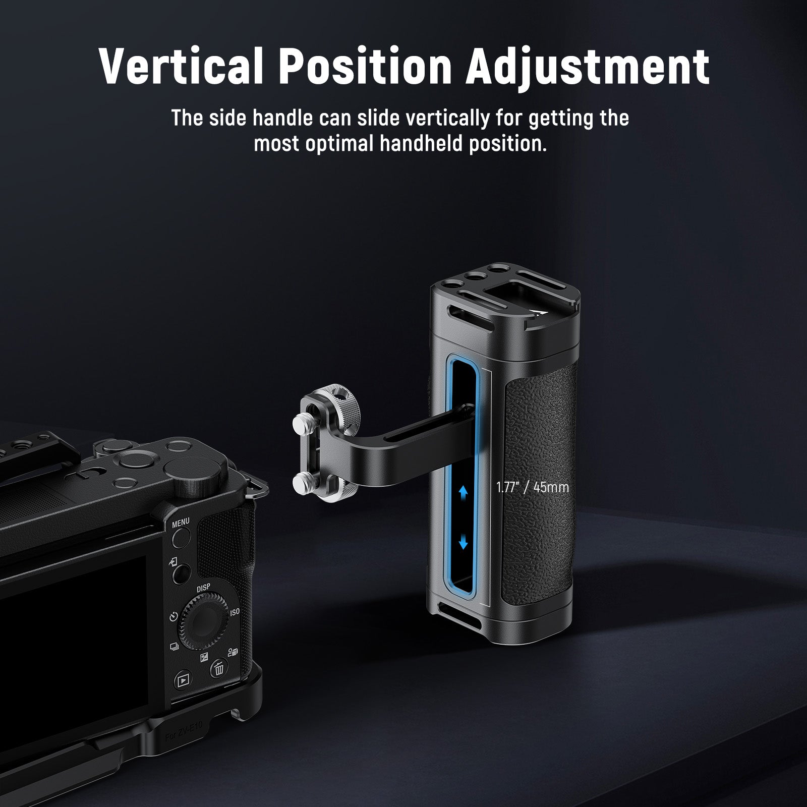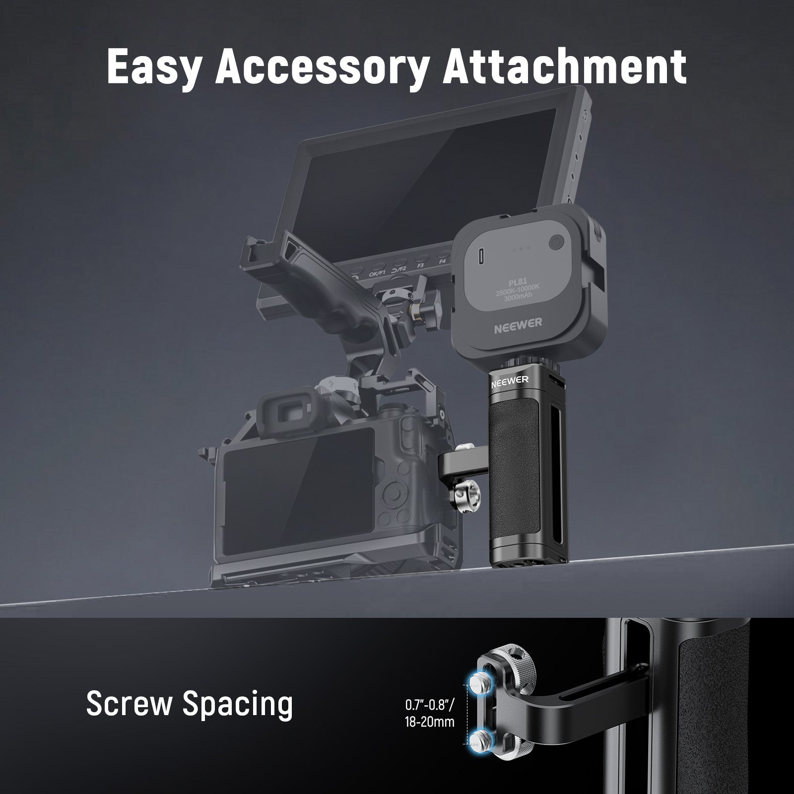 - Lightweight Universal Side Handle- This compact and lightweight side handle attaches to your camera cage or video rig via two 1/4" thumbscrews. With adjustable 0.7"-0.8" (18-20mm) screw spacing, it is compatible with SmallRig cages and NEEWER camera cages (CA020 CA019 CA014 CA011 CA002) and helps you stabilize a DSLR or mirrorless camera of up to 33lb/15kg (Not compatible with Tilta)