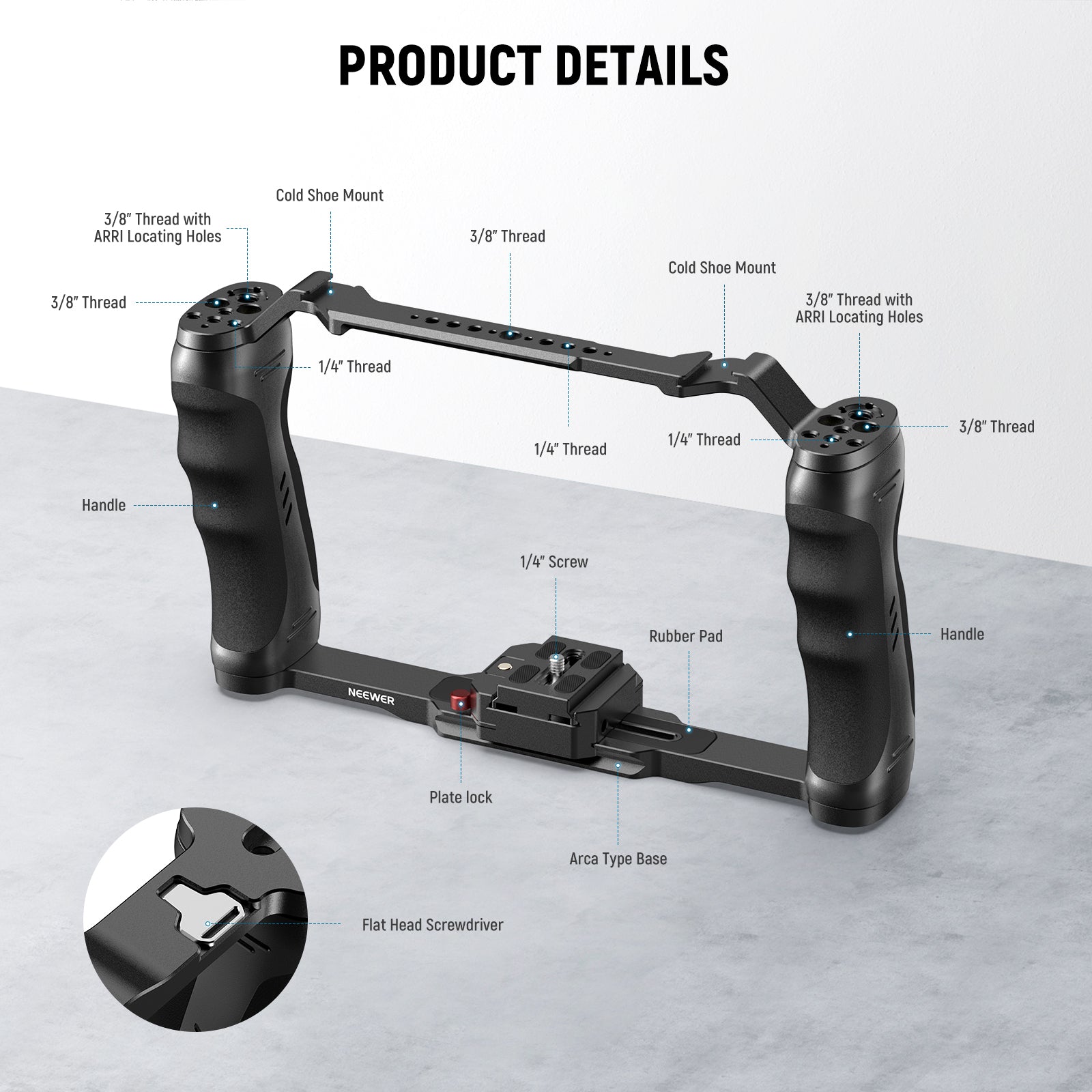 - Convenient Tripod Mounting- Via the Arca type baseplate, this camera cage can attach to NEEWER LT35/TP22/TP65 Tripods, GM27/GM30/GM36 Tripod Ball Heads, SR006 Baseplate with 15mm Rod Clamps, and other devices. Also compatible with SmallRig
