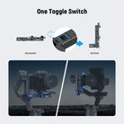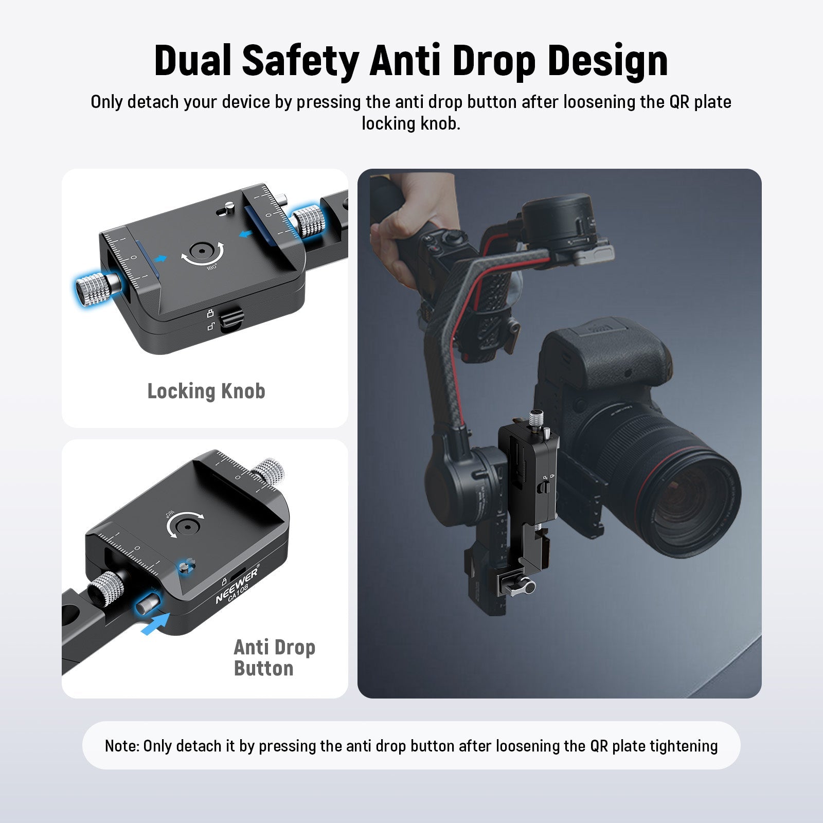 - Dual Safety Anti Drop Design- Secure your camera or other devices to the stabilizer with two tightening knobs for the quick release plate and the stabilizer clamp, and a toggle lock for the 180° rotatable QR base. The dual safety design keeps your device secure as you can only detach it by pressing the anti drop button after loosening the QR plate tightening knob
