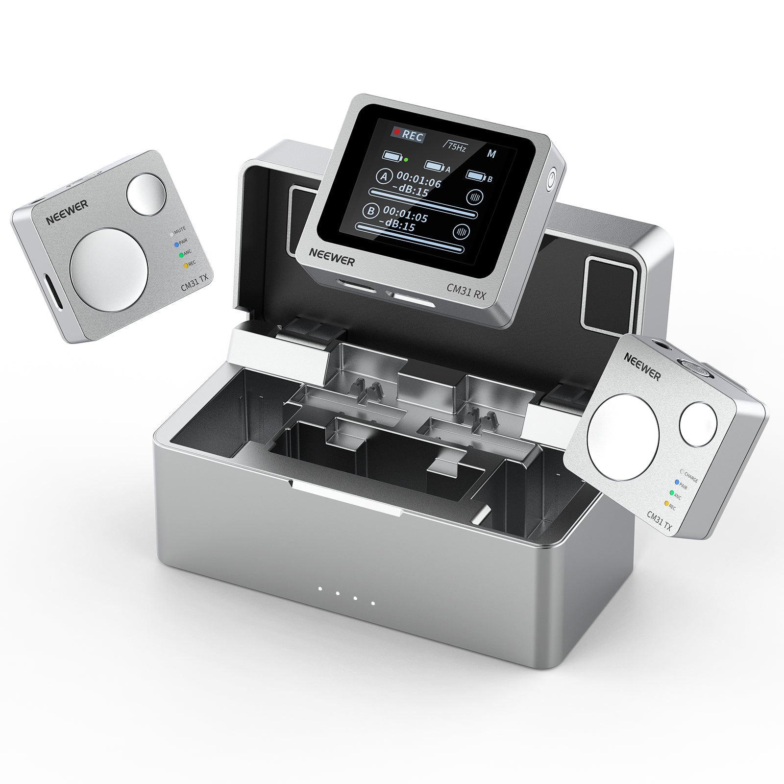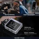 - User Friendly Reversible LCD Screen- The RX features a 1.3" LCD screen that can switch between single and dual device interfaces. Press the "M" button three times to rotate the screen 180° and make it more friendly for videographers. Double press the volume button to adjust screen brightness. Four indicator lights on the TX provide notify you of current status of the device