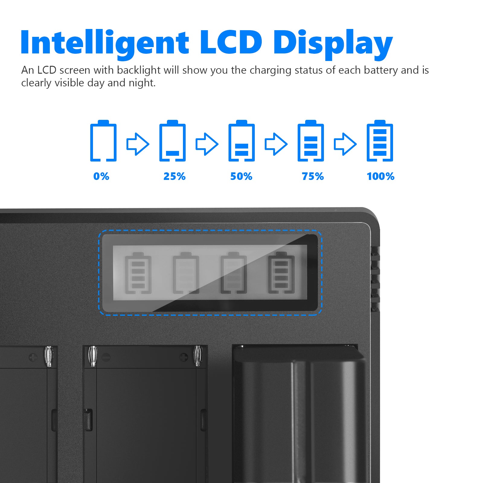 - An LCD screen with a backlight will clearly show you the charging status of each battery, whether it’s day or night.