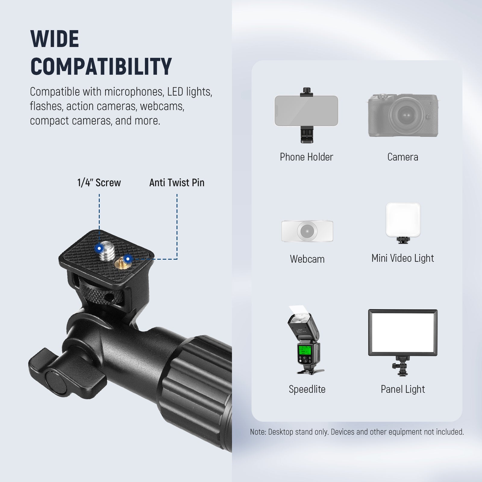 - Flexible Desk Stand Extension- With a length of 22"/56cm, this 2 section auxiliary holding arm is designed for horizontal installation on desk stands for overhead shots, providing flexibility to expand your setup for easy installation of cameras, webcams, fill lights, ring lights, or microphones. The desk camera mount arm also includes a phone clip to hold smartphones within 2.3"-3.3"/58-85mm