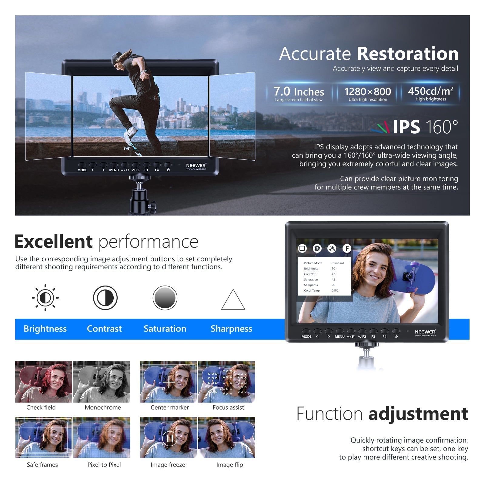 - External Field Monitor- Featuring a 7“ IPS screen, HD 1280 x 800 resolution, 450cd/m2 of brightness, a contrast ratio of 1200:1, an aspect ratio of 16:10, and 0.07875 x 0.07875mm dot pitch, this monitor is handy for video shooting. The terms HDMI, HDMI High-Definition Multimedia Interface, HDMI Trade dress and the HDMI Logos are trademarks or registered trademarks of HDMI Licensing Administrator, Inc.