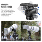 - Low Profile Ball Head & 360° Pan Base- This gimbal head features a 360° ball head and a single U notch for 90° vertical shooting, with an enlarged knurled knob for seamless transitions between vertical and horizontal shots. Also includes a pan base that can rotate 360° for panoramic views