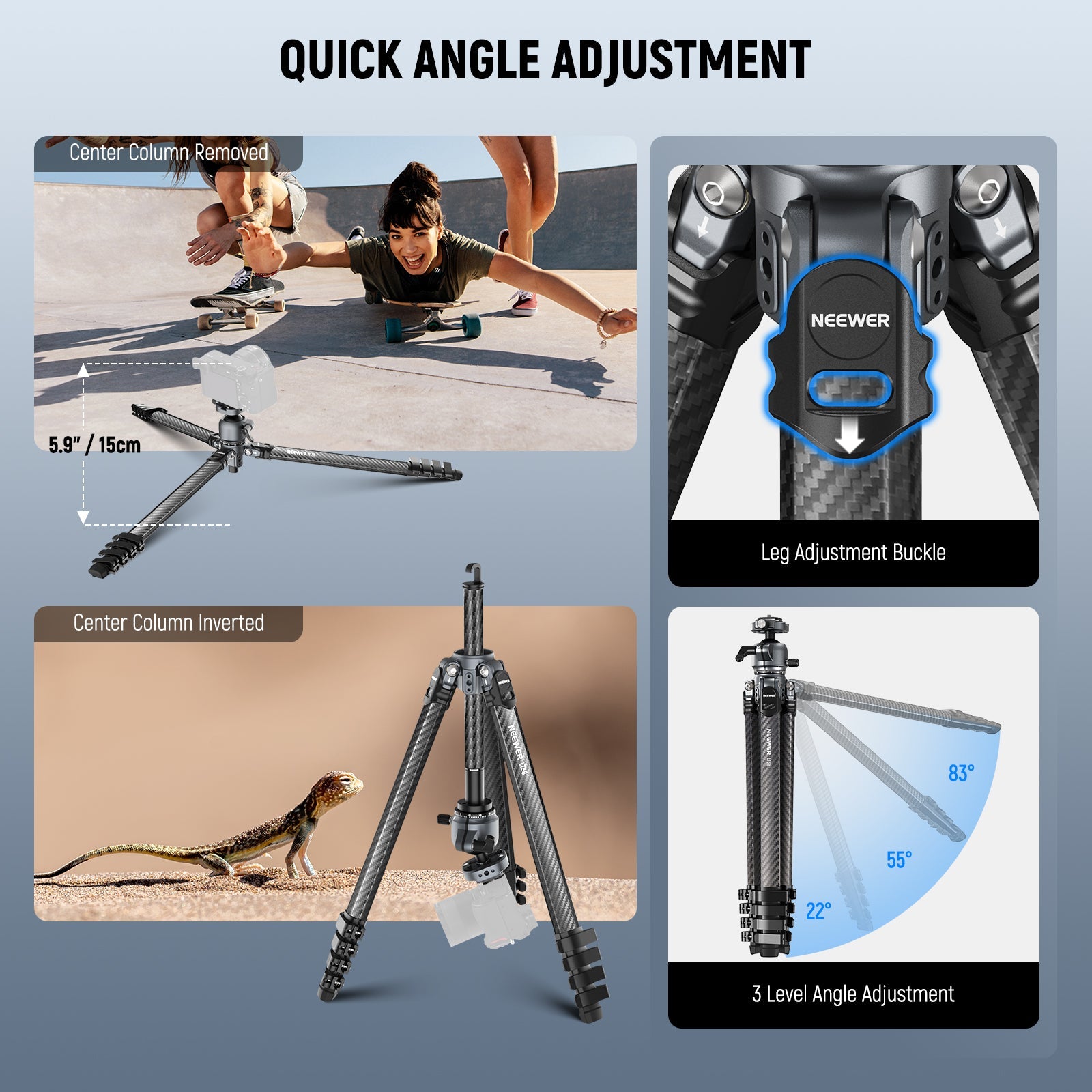 - Quick Release Height via Spring Flip Buckles- Spring loaded metal buckles swiftly pop up and unlock with a half open motion, enabling rapid, safe and stable height adjustment. With 5 section tube legs, the portable tripod can be adjusted from 18"/46cm to 61"/155cm, and offers three fixed angles of 23°, 55°, and 83°. The center column can be converted or inverted for low angle macro shooting at a height of 5.9"/15cm, the center column also includes a built in hook for hanging weights