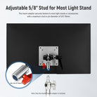 - Adjustable 5/8” Stud for Stand Mount- Secured by a handy hand tighten screw knob, the stand mount adapter can firmly attach to most stands or accessories with a 5/8” stud or pin.Note: Light stand is Not included