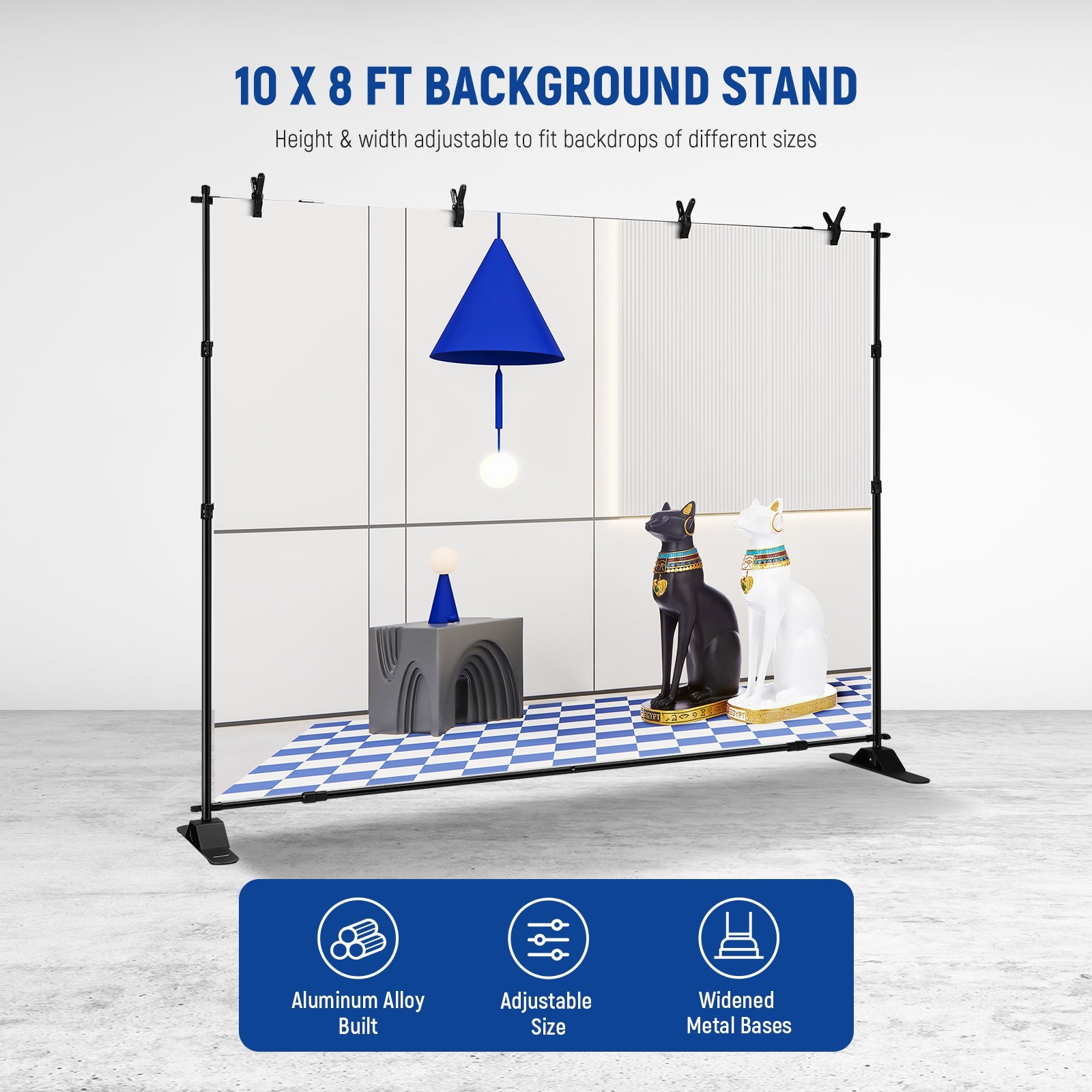- Ultra Stable Photography Background Support System- Crafted from premium aluminum alloy, this 10 x 8ft / 3.1 x 2.4m backdrop stand features two widened metal bases for unmatched stability up to 11lb/5kg. Also comes with cross bars and retractable extension poles for more flexible backdrop sizes and compositions, and can be packed in the carrying bag for easy storage and transport