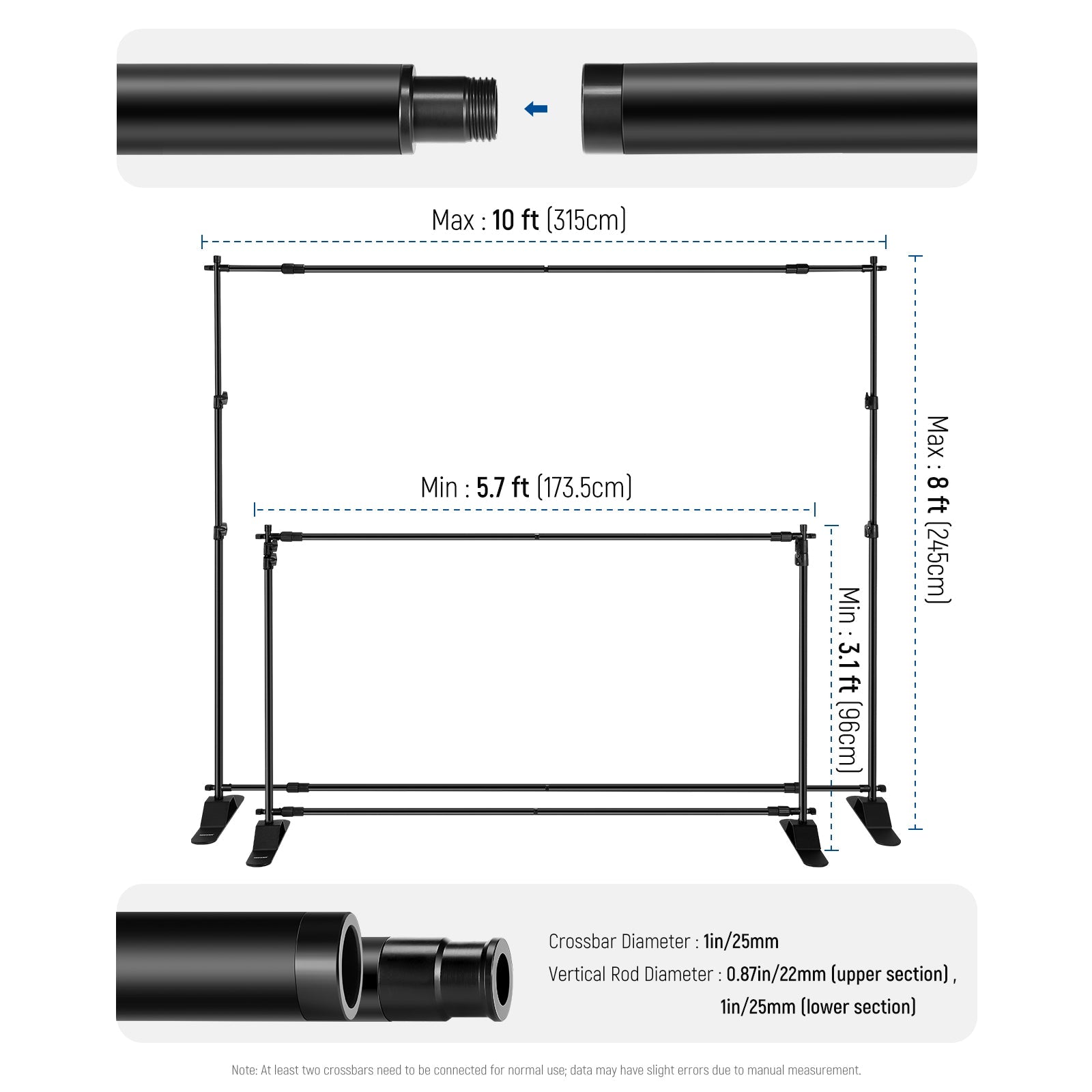 - Customizable Height & Width- With four detachable crossbars (two upper, two lower) and two telescopic extension poles, this adjustable backdrop stand easily adjust width from 5.9ft/180cm to 9.8ft/300cm by adding or removing crossbars, and set at your preferred height from 3.2ft/98cm to 8ft/245cm with a simple twist