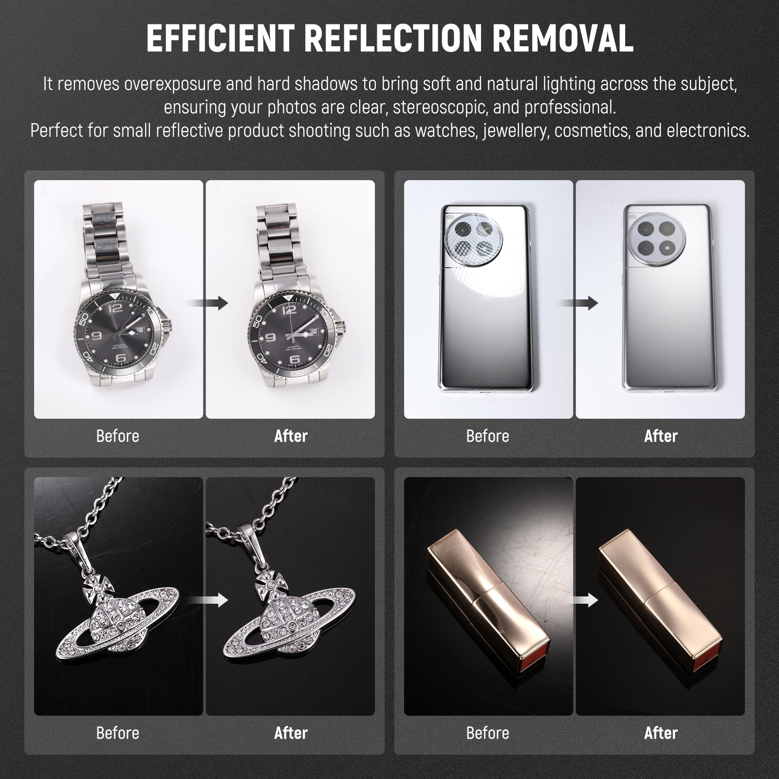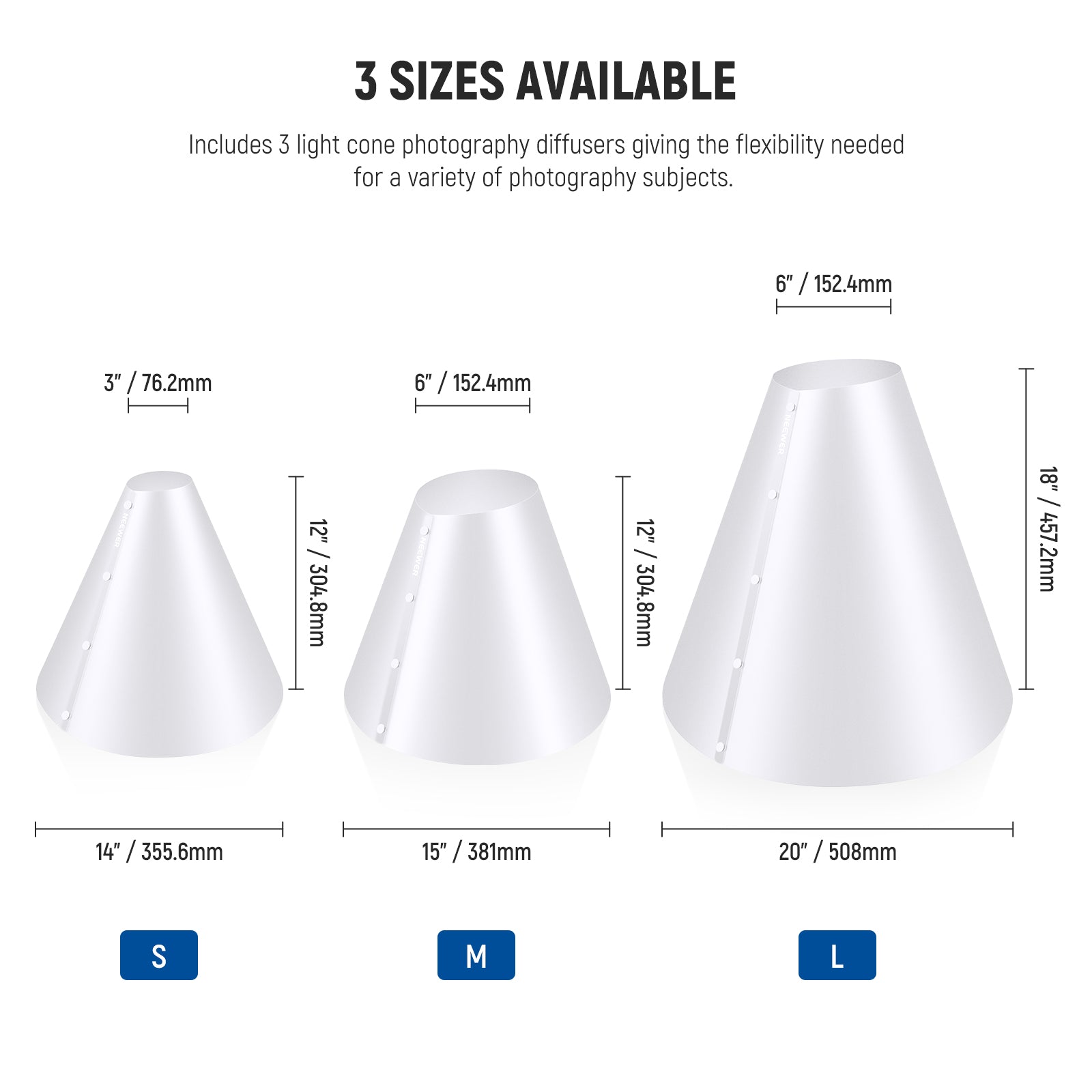 - 3 Sizes Available- 3PCS light cone photography diffusers (14"/356mm, 15"/381mm, 20"/508mm) give the flexibility needed for a variety of photography subjects. Perfect for capturing rings, necklaces, jewelry, watches, lipsticks, and other small personal reflective items, also applied to household reflective products like taps, showers, kettles, toasters, and hair dryers. Even the smallest cone is compatible with iPhone 15 to make a perfect display of your products
