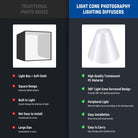 - 360° Light Cone Surround Design- The light cone for 360 degrees surrounds the subject, providing 360° soft lighting adjustment to eliminate harsh glare from shiny products efficiently. The slanted top opening allows for easy shooting and offers diversified angles to capture the best shots of your subjects