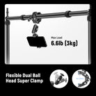 - Flexible Dual Ball Head Super Clamp- The flexible 360° rotatable dual ball heads can be adjusted to any angle for any overhead shooting views, and the super clamp on the other end tightly mount to the crossbar with a hand tighten knob. With 1/4" threads, 3/8" threads, locating points and a built in cold shoe mount, the super clamp and magic arm can attach accessories like a phone holder (included), monitor, camera cage, microphone, LED lights and more. Max Load 6.6lb (3kg)