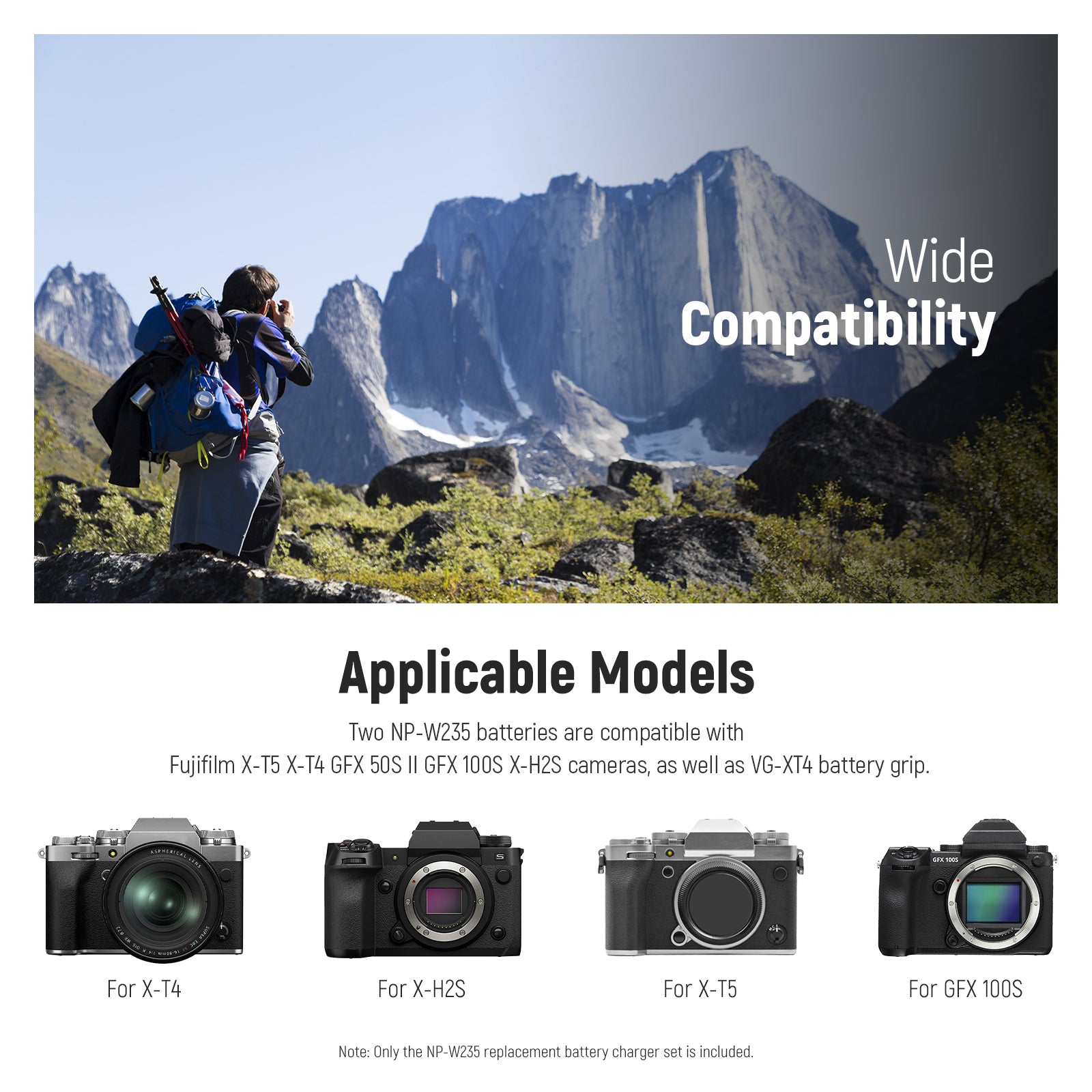 - Fully Compatible with Fujifilm- Equally powerful replacement for original NP-W235 battery, the two rechargeable camera batteries are fully compatible with Fujifilm?X-T5 X-T4 GFX 50S II GFX 100S X-H2S cameras, as well as VG-XT4 battery grip