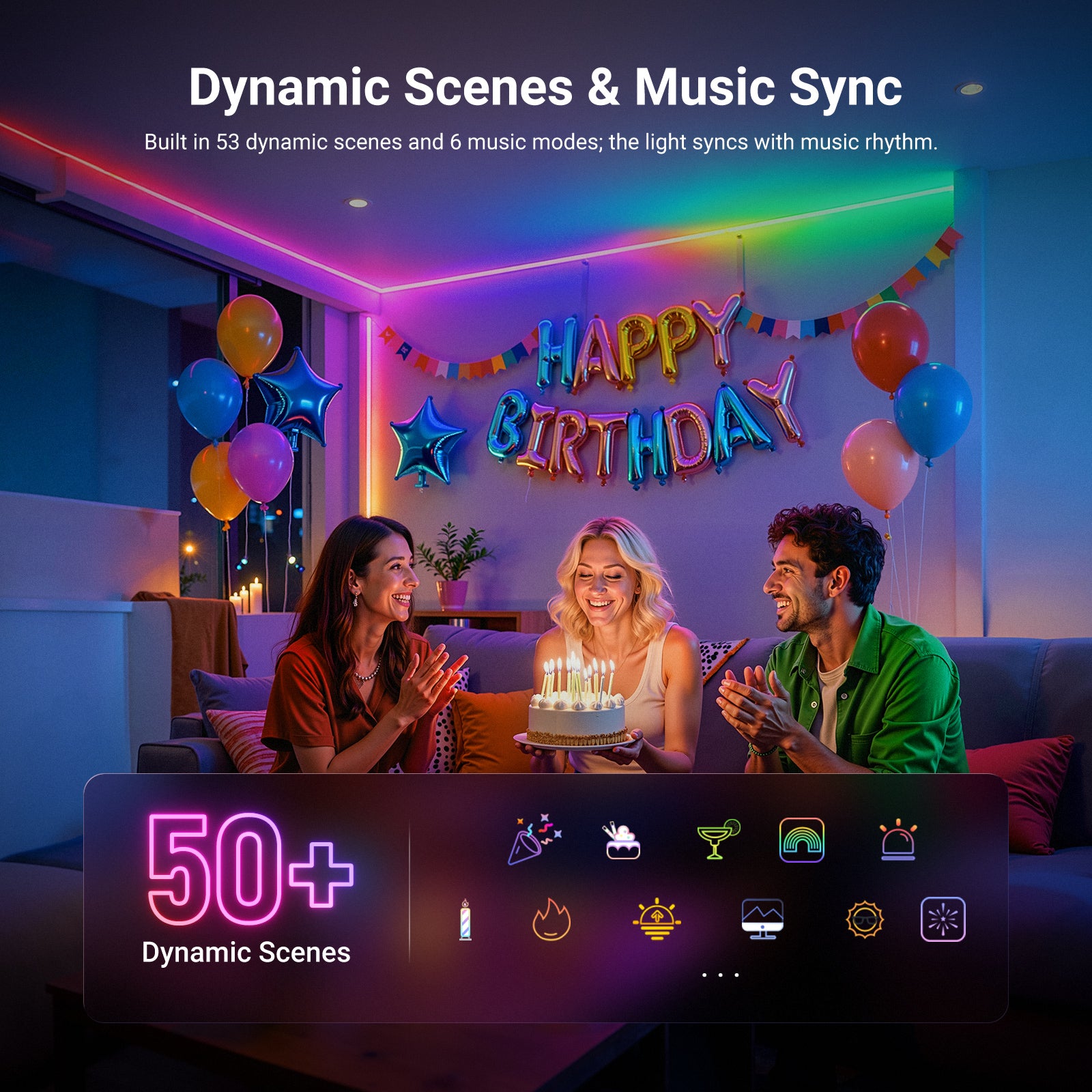 - Dynamic Scenes & Music Sync- The LED neon rope light offers 50+ preset scenes inspired by Daily Life, Holidays, Emotions, and Nature, with continuous updates adding more effects for novelty lighting to suit your needs. The included control box features a built in microphone that detects music in real time, enabling the rainbow light strip to change colors in sync with music beats or game sound effects, easily creating a dynamic and immersive atmosphere
