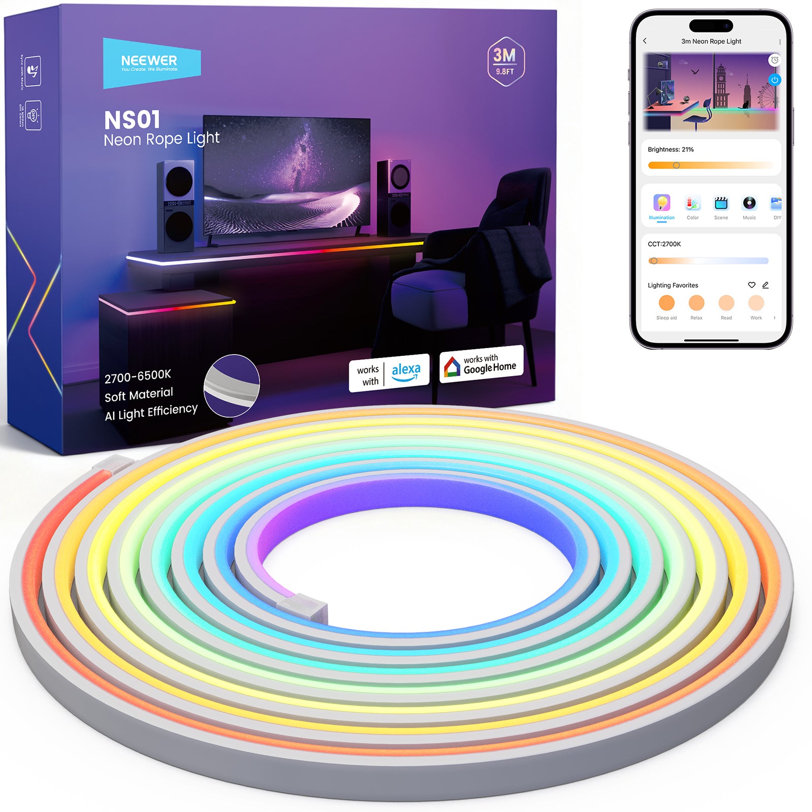 - AI Design & Creative DIY Mode- Powered by the NEEWER Smart AI Lighting Engine, the waterproof LED neon rope light can generate lighting effects based on your voice, text, or image commands. The Creative DIY Mode lets you unleash your imagination to customize endless personalized lighting effects. Ideal colored strip decorations for home, bedroom, living room, bathroom, bed room bunk, gamer gaming, music studio, dorm ceiling, bar, festival, party, etc.