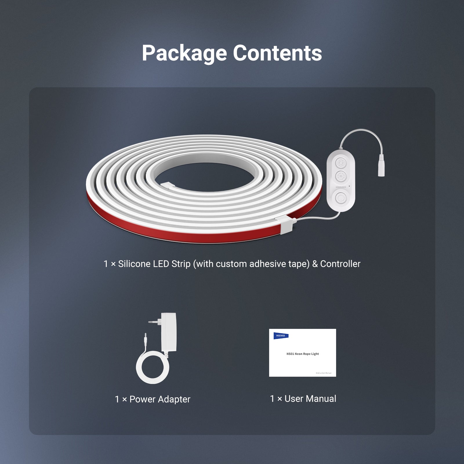 - Bright & Flexible Silicone Strip Light- The NS01 neon LED strip is made of pure waterproof silicone, soft, flexible, and easy to bend, allowing easy installation in bedrooms, corners, eaves, along walls, or inside wardrobes. The front emitting design, with 252 LEDs (84 LEDs/m) embedded in the high transmission silicone strip, delivers bright, natural, and diffused colorful light for a dreamy & inviting home ambiance. Note: The controller and power adapter are NOT waterproof.
