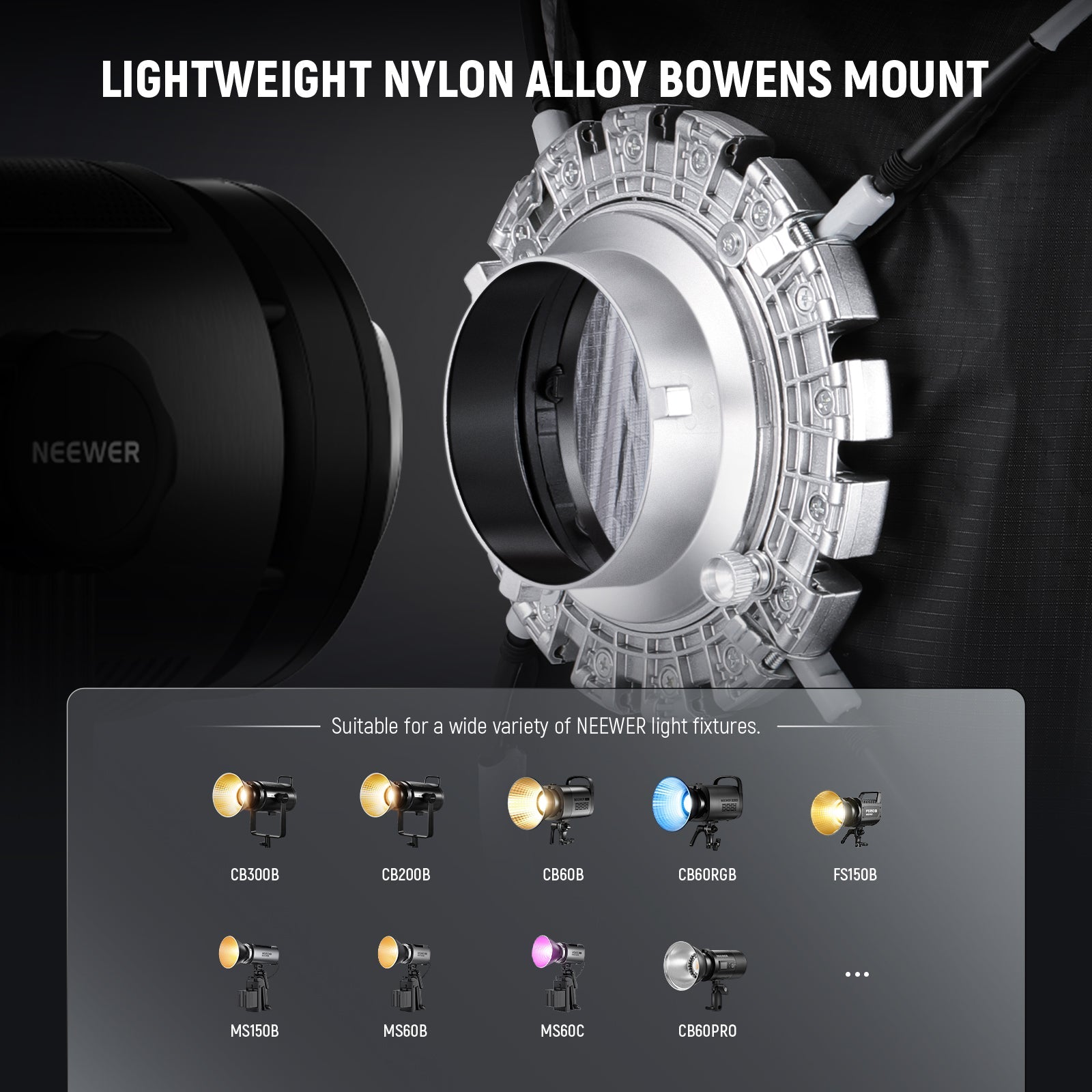 - Attach Via Bowens Mount- This photography softbox diffuser with standard Bowens mount is compatible with various studio lighting equipment, strobe flashes speedlights monolights, and continuous output COB LED video lights, including NEEWER Vision 4 Q4 CB300B CB200B FS150B CB100C MS150B MS60C MS60B CB60 RGB S101-300W/400W PRO, compatible with Aputure 300c 200X 60D 60x S, compatible with Godox SL60w, compatible with SmallRig RC 120D RC 120B, etc