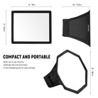 - Octagonal Diffuser Softbox- The 6" octagonal diffuser softbox can broaden the light source and enable you to achieve a balanced and wrap around illumination that eliminates shadows and reduces blemishes at the same time