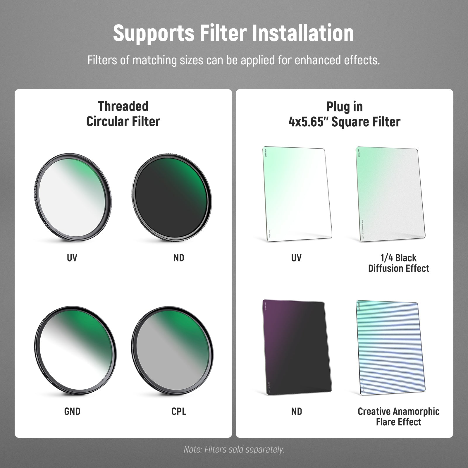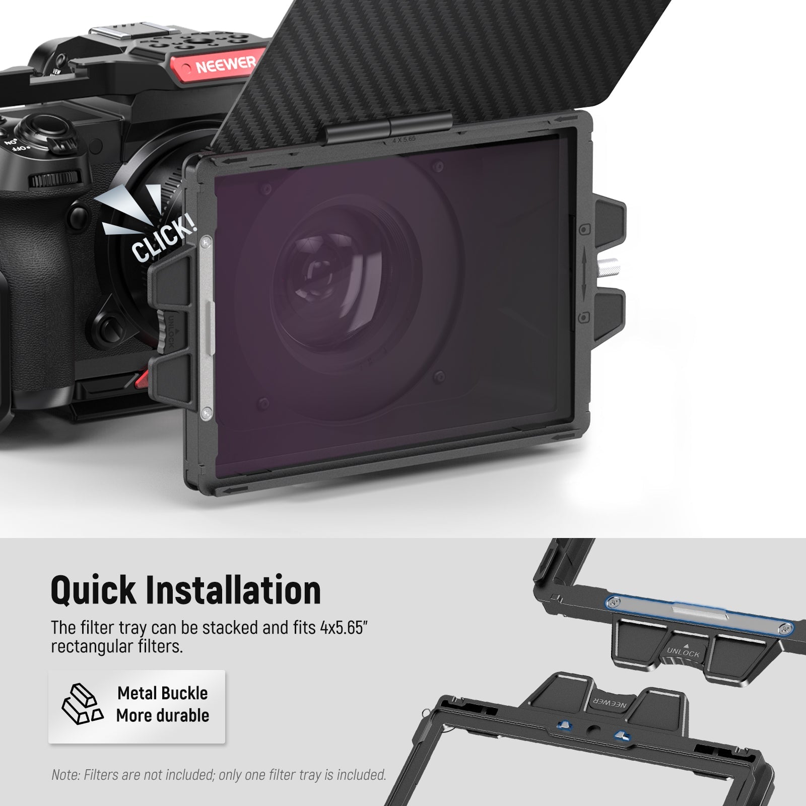 - 4" x 5.65" Standard Filter Tray- The included one filter tray fits 4"x5.65" rectangular filters (not included). Filters (sold separately) can be secured by the filter tray screw knobs and protected by rubber pads. Compatible with K&F Compatible with NISI Compatible withTIFFEN Compatible with Tilta Compatible with SmallRig square filters for filming