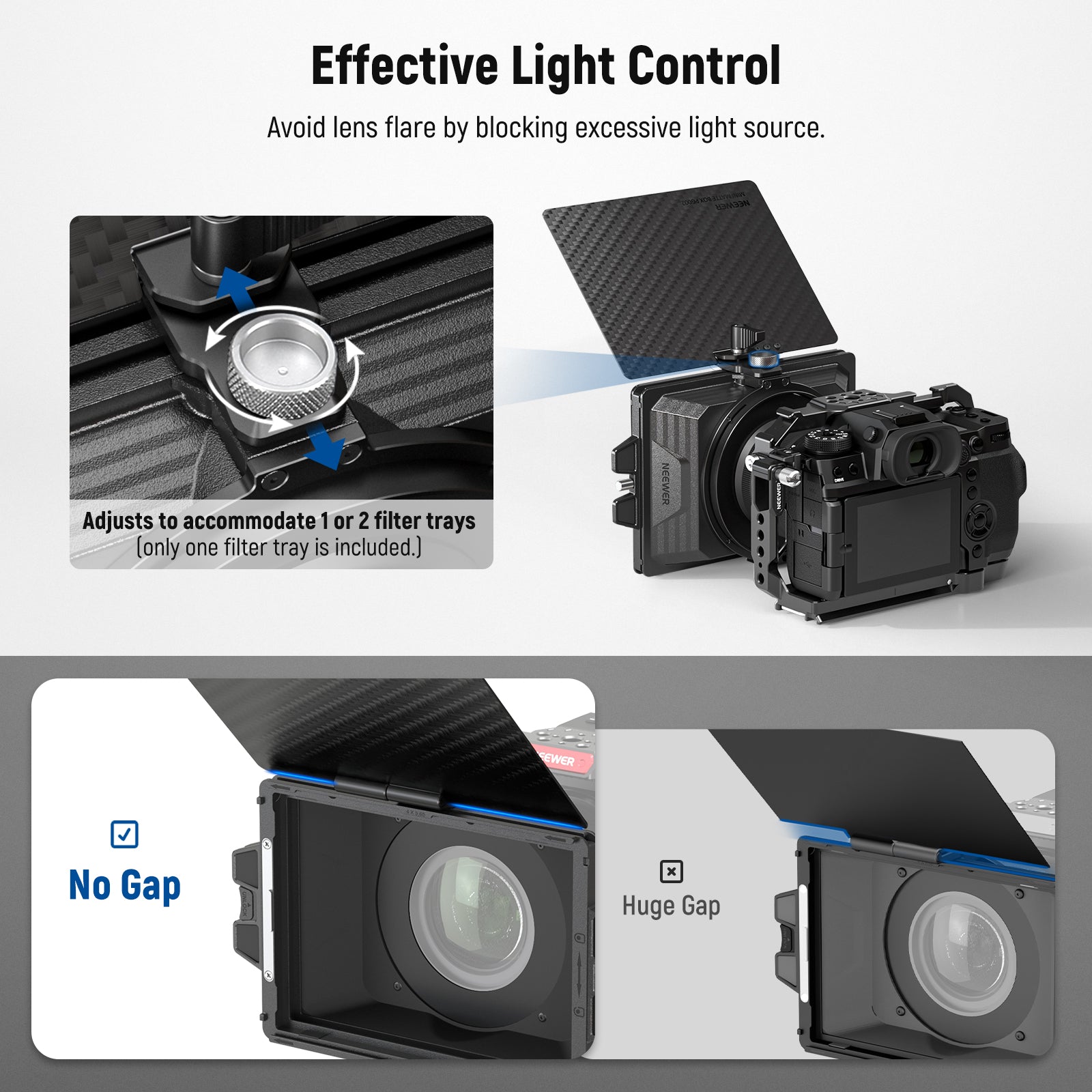 - 180° Adjustable Top Flag- Tilt the top flag at 180° to block excessive light and prevent lens flare. Fold down the flag to cover the front filter and protect the lens. The top flag lock firmly secures the flag in place, and the thumb screw allows you to adjust the flag back and forth to fasten the filter tray for perfect light blockage