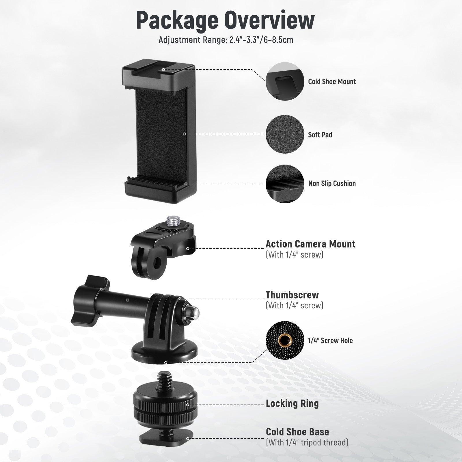 - Package contains: 1x Hot Shoe Mount (with 1/4" tripod thread), 1x Action Camera mount (with 1/4" tripod connection), 1x Thumbscrew,1x Action Camera mount adapter (with 1/4" tripod thread), 1x Universal Phone Holder (with 1/4" tripod connection)