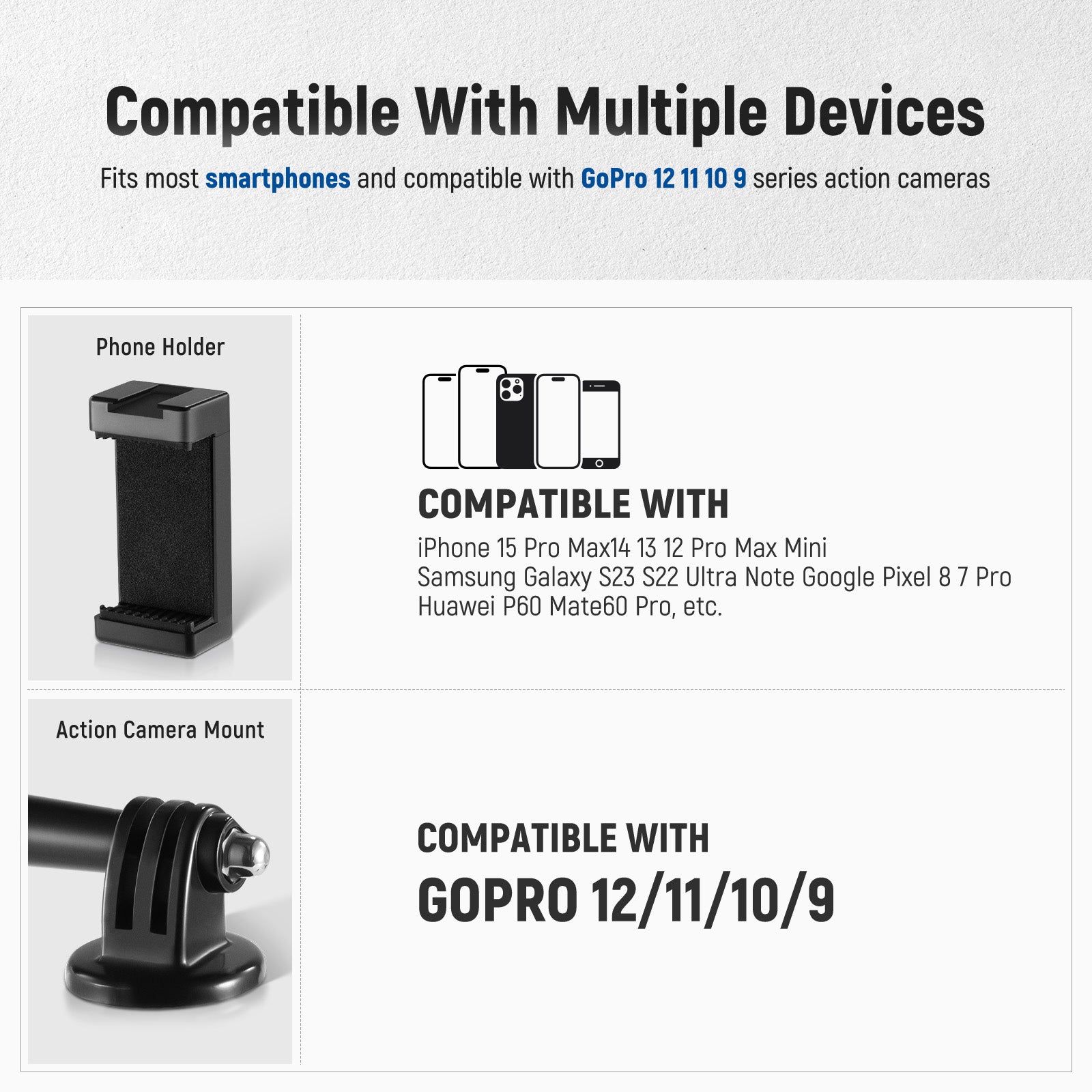 - Compatible with iPhone 12 11 Pro Max X XR Samsung Huawei GoPro Hero 11 10 9 8 7 6 5 DJI OSMO Action and other devices within the width of 2.4-3.3 inches (6-8.5 cm)