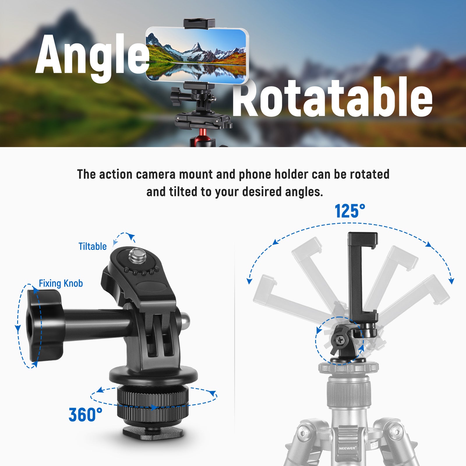 - The action camera mount with 1/4" thread and phone holder can be installed on a tripod, and both of them can be rotated and tilted to desired angles.