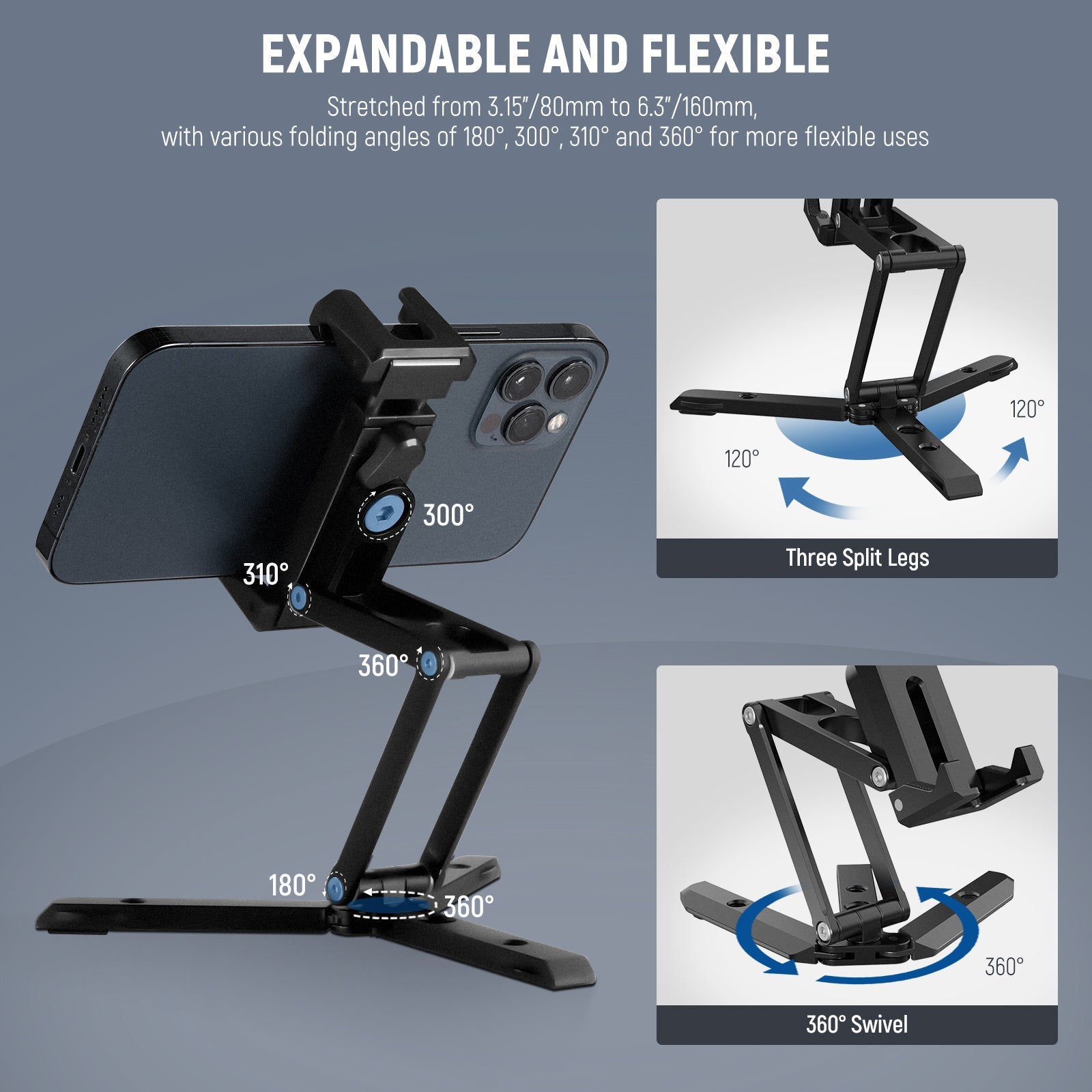- Tri Fold Expandable & Flexible Angles- The upgraded tri fold design includes an additional spread height and a larger grip for convenience. The length can be stretched from 3.15"/80mm to 10.24"/260mm, the max expanded height is 7.1"/180mm, and each folding angle supports 310°, 360°, 180° of adjustment. With a 360° rotating pivot at the bottom, it allows for easy phone camera locating in overhead, upward, vertical, and other shooting positions