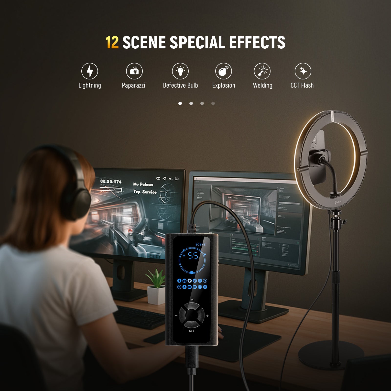 - Dimmable CCT Mode & 12 Scene Effects- CCT Mode offers 2900K-7000K warm and cool lighting along with 0-100% dimming. The brightness adjustable lighting flatters all skin tones and minimizes blemishes. FX Mode has built in 12 realistic scene effects for professional video shooting, such as Paparazzi, Defective Bulb, and Explosion. An RT116 remote control is included to enable remote phone selfies via Bluetooth connection