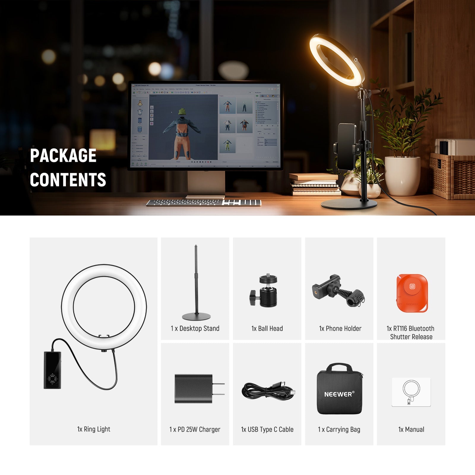 - 18W Bi Color Ring Light with PD 25W Charger- NEEWER 18W powerful LED ring light for desk boasts 144 LEDs (72 cool white & 72 warm white) provide bright, diffused, even light with up to 1380lux/0.5m illumination and high color fidelity with CRI95+/TLCI97+ to reproduce true to life colors. For phones, laptops, and computers, with fast charging to provide key or soft fill lighting for remote working, as content creator essential gear and influencer must have for photography and videography