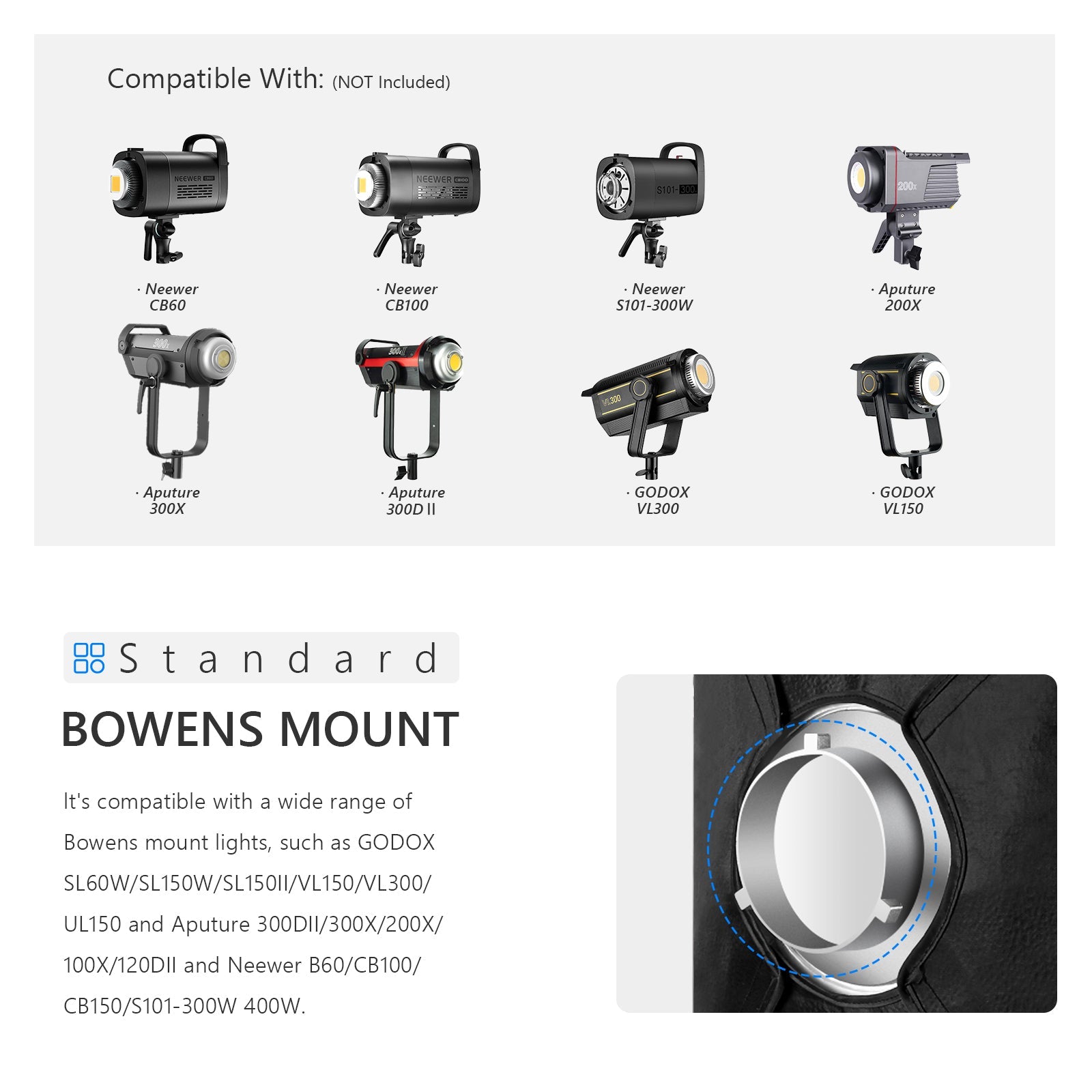 - Bowens Mount Design- Compatible with monolights, continuous LED lights, and other light fixtures that feature the Bowens mount, including NEEWER SL70, CB60, CB100, CB150, Vision 4, Vision 5, S101-300W, S101-400W, and more